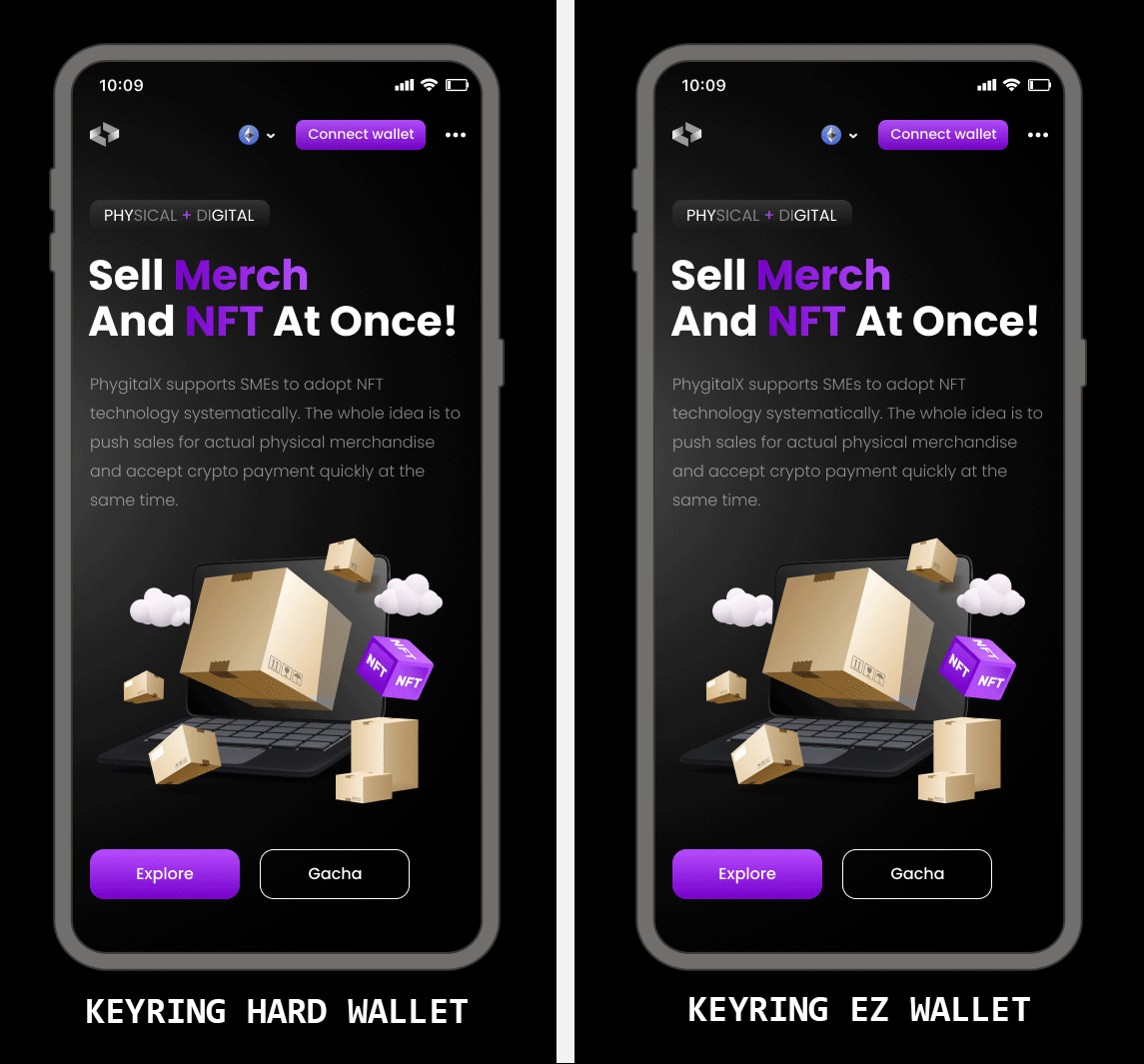 現在、Bacoor Inc.のエコシステム内で、[Phygital X](https://phygitalx.io/)と[KEYRING NFT Viewer](https://nft.keyring.app/)の2つのウェブサイトがKEYRING Connect機能を実装しています。