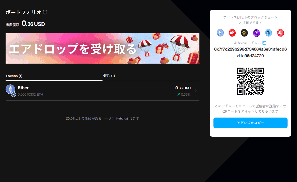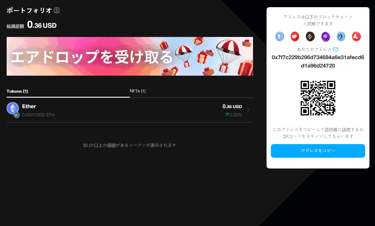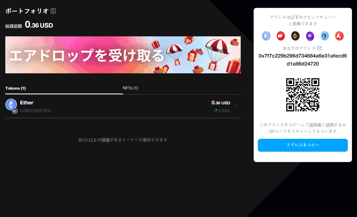 ウォレットアドレスをコピーして送信者と共有するか、送信者に QR コードを直接スキャンしてもらいます。
