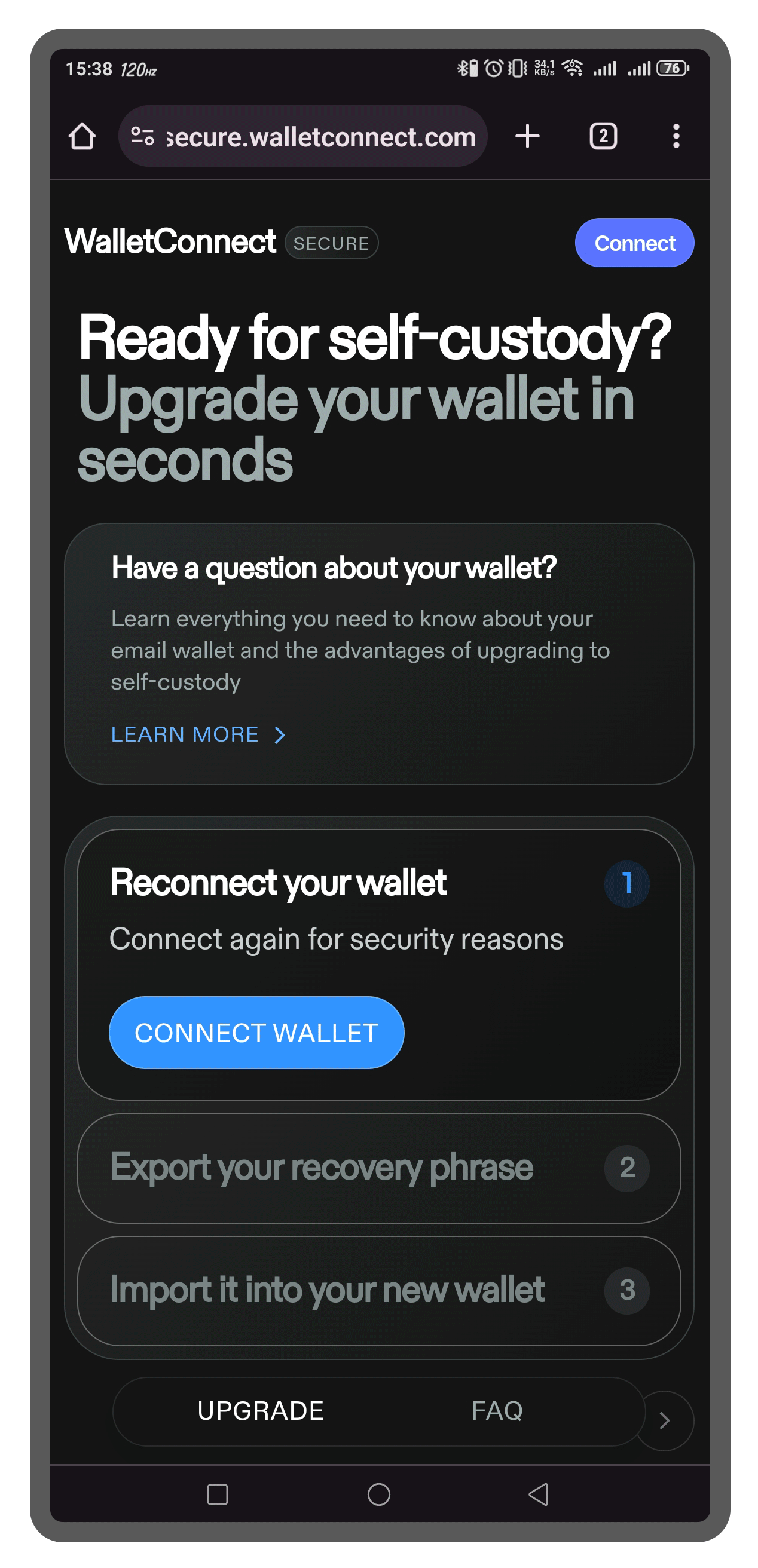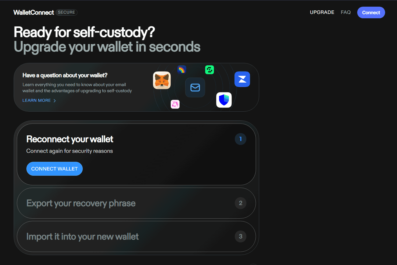 KEYRING Email Wallet は Wallet Connect のインフラを利用しているため、ウォレットのセキュリティ情報は Wallet Connect プラットフォームに保存されています。そのため、シードフレーズを確認するには、Wallet Connect のウェブサイトにアクセスする必要があります。