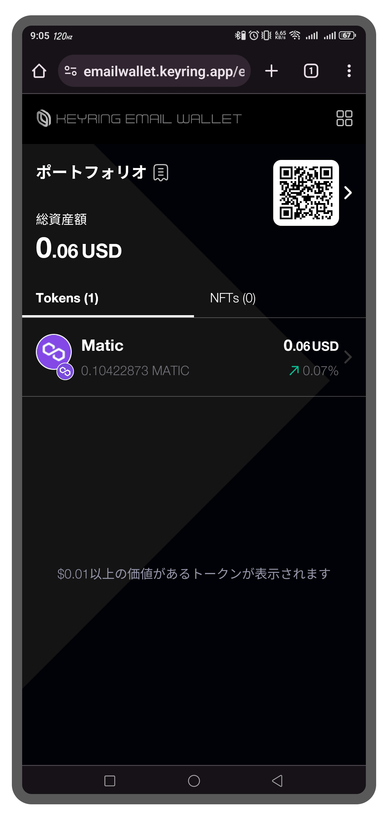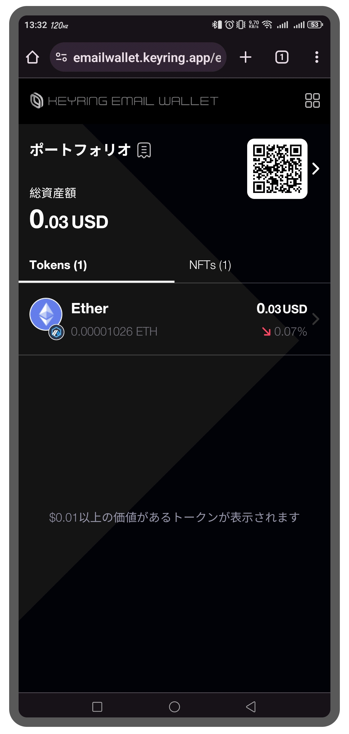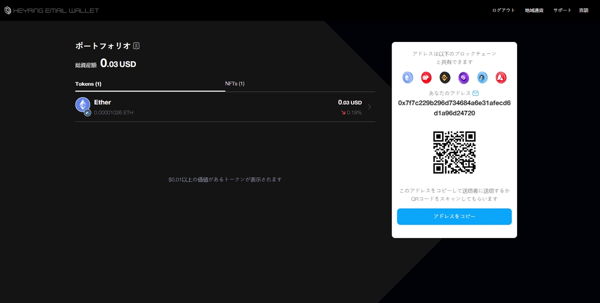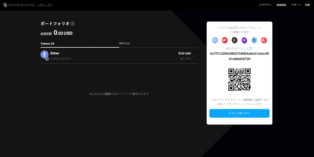 KEYRING Email Wallet のメインインターフェースで、ウォレットアドレスと QR コードが表示されます。