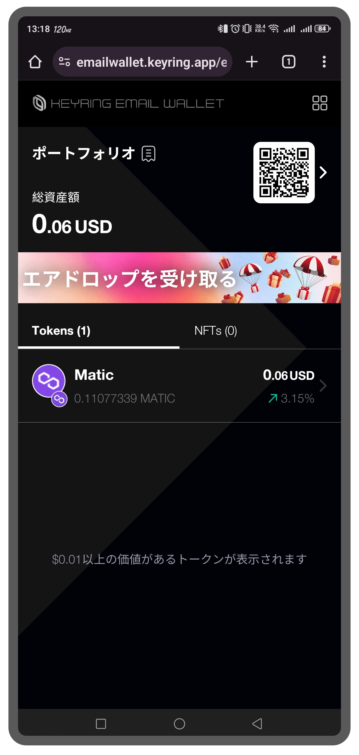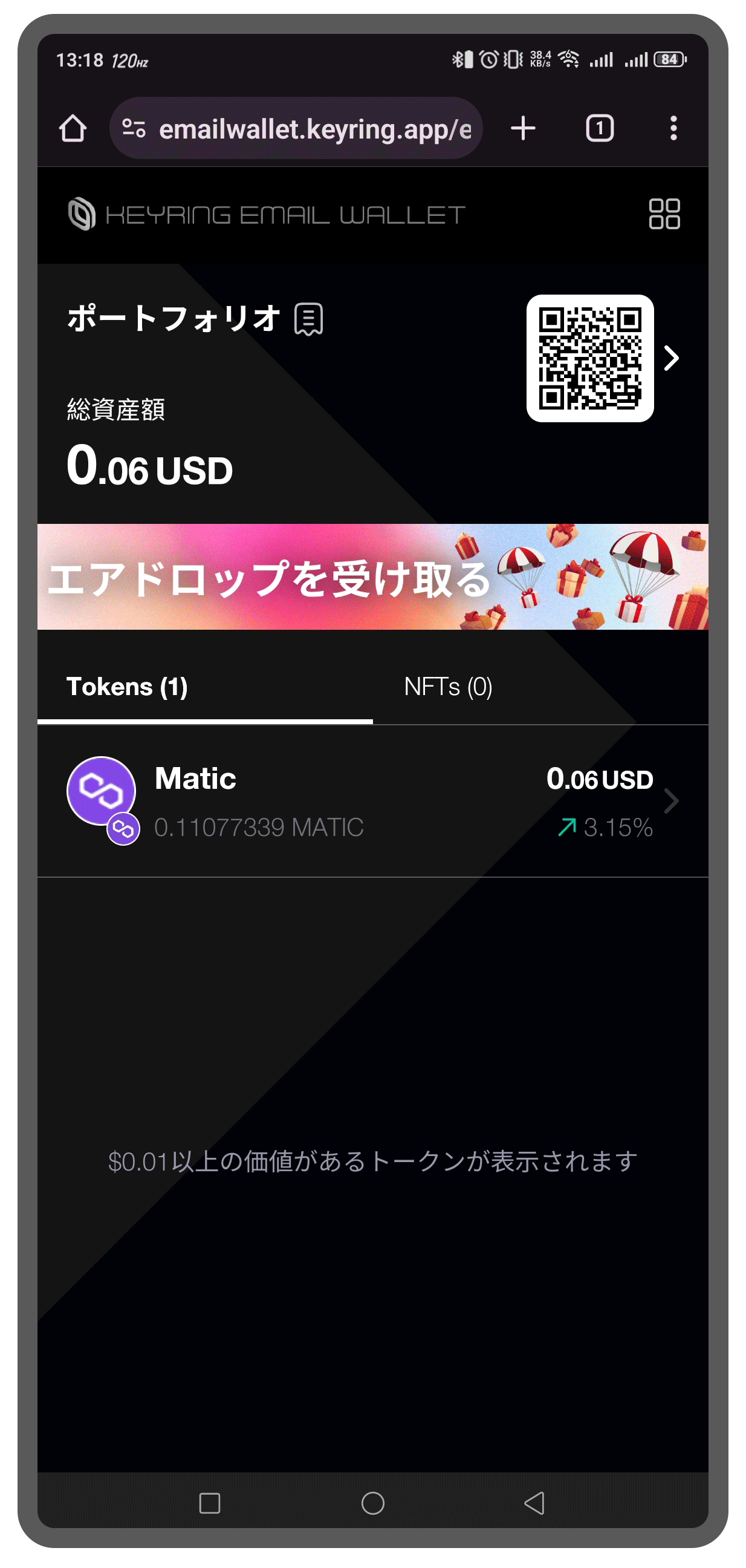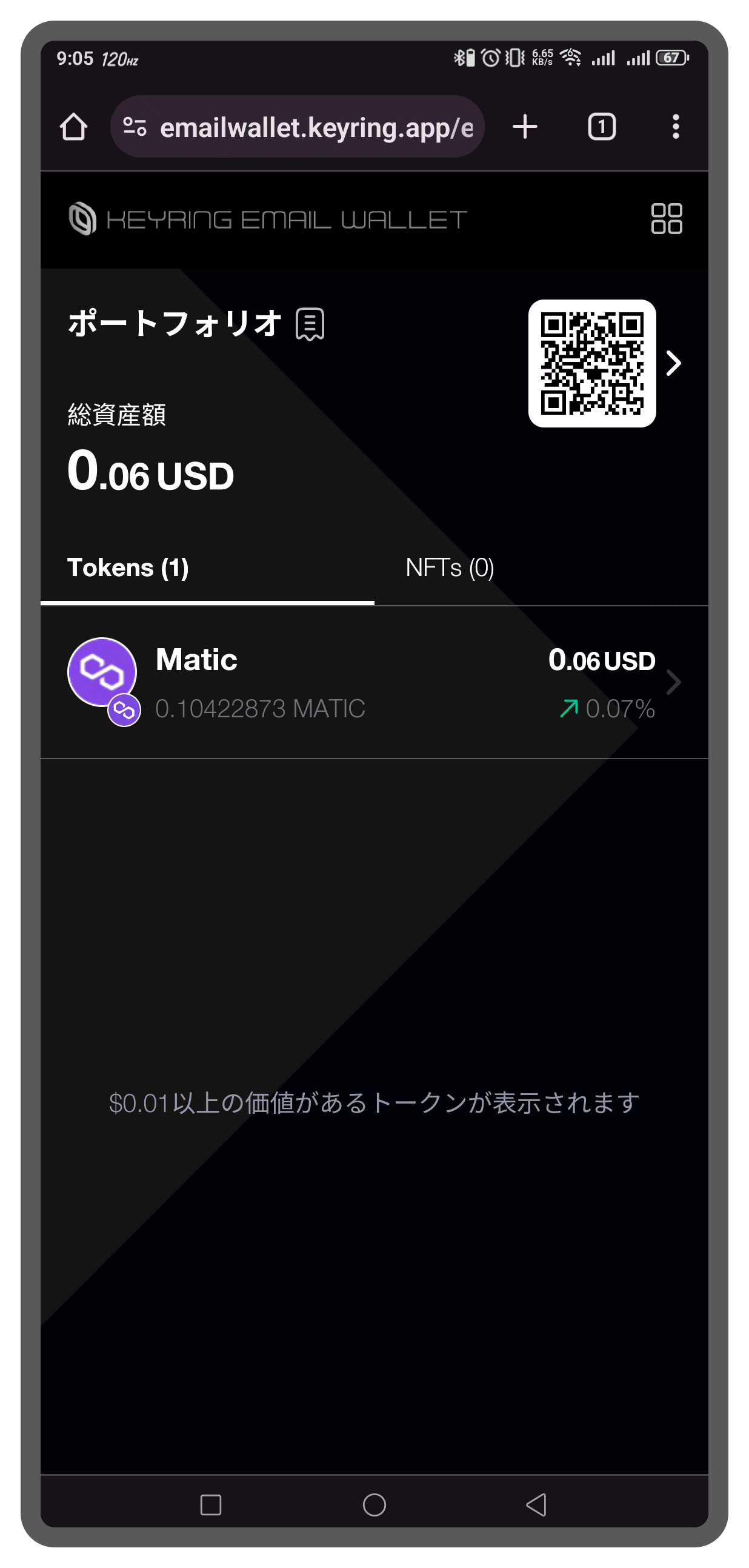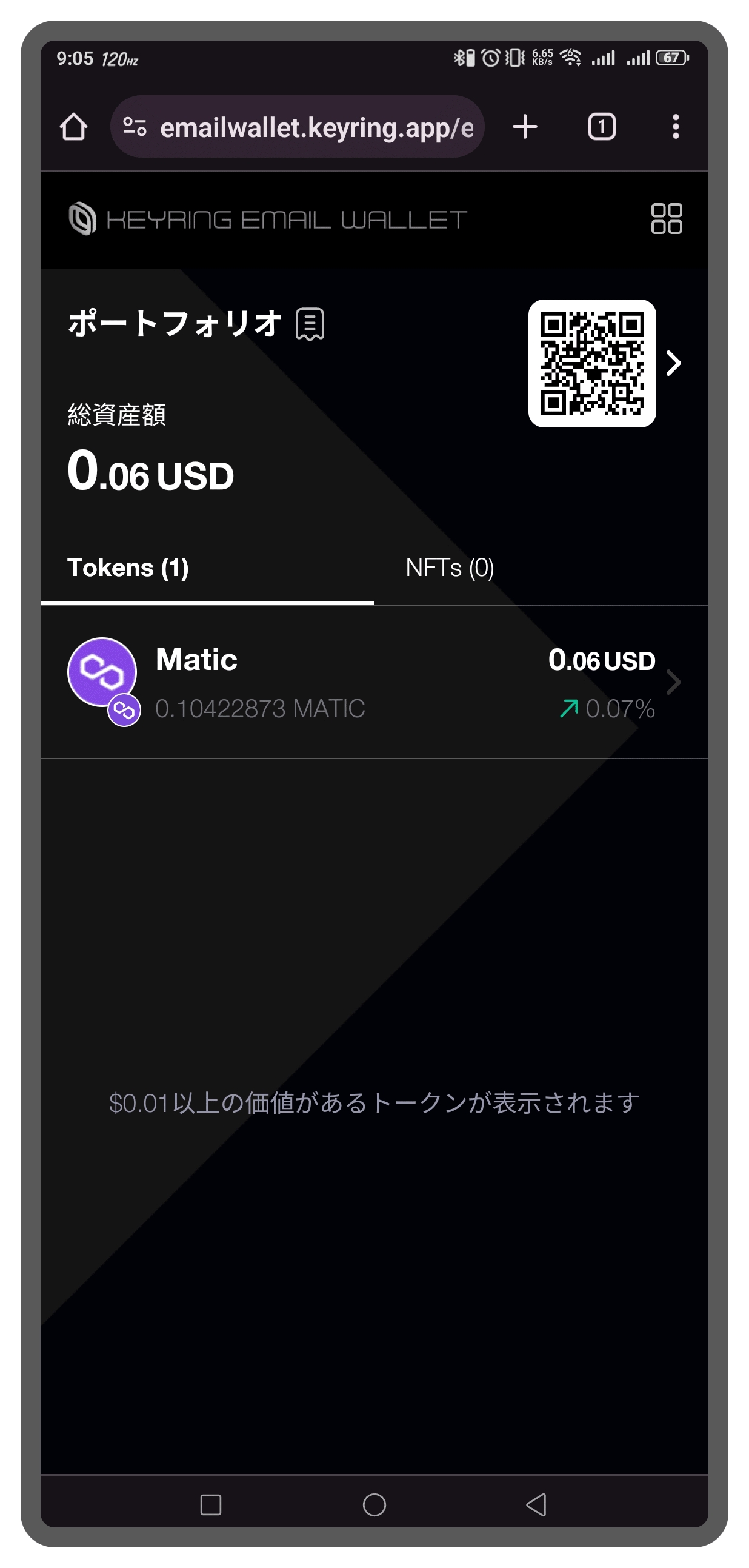 KEYRING Email Wallet のメインインターフェースで、ウォレットアドレスと QR コードが表示されます。