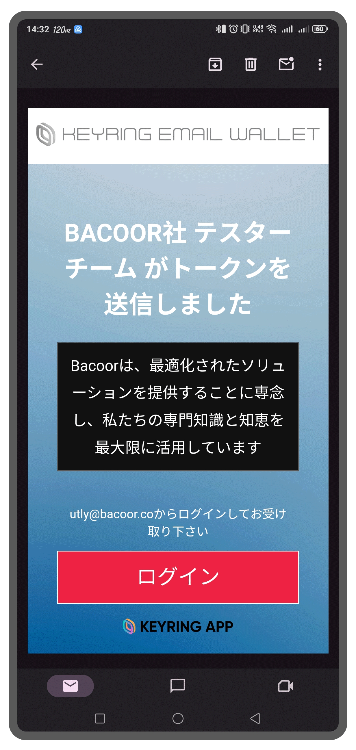 アカウント設定の完了: アカウントを作成した後、トークンを受け取ったメールアドレスでKEYRING Email Walletにログインします。