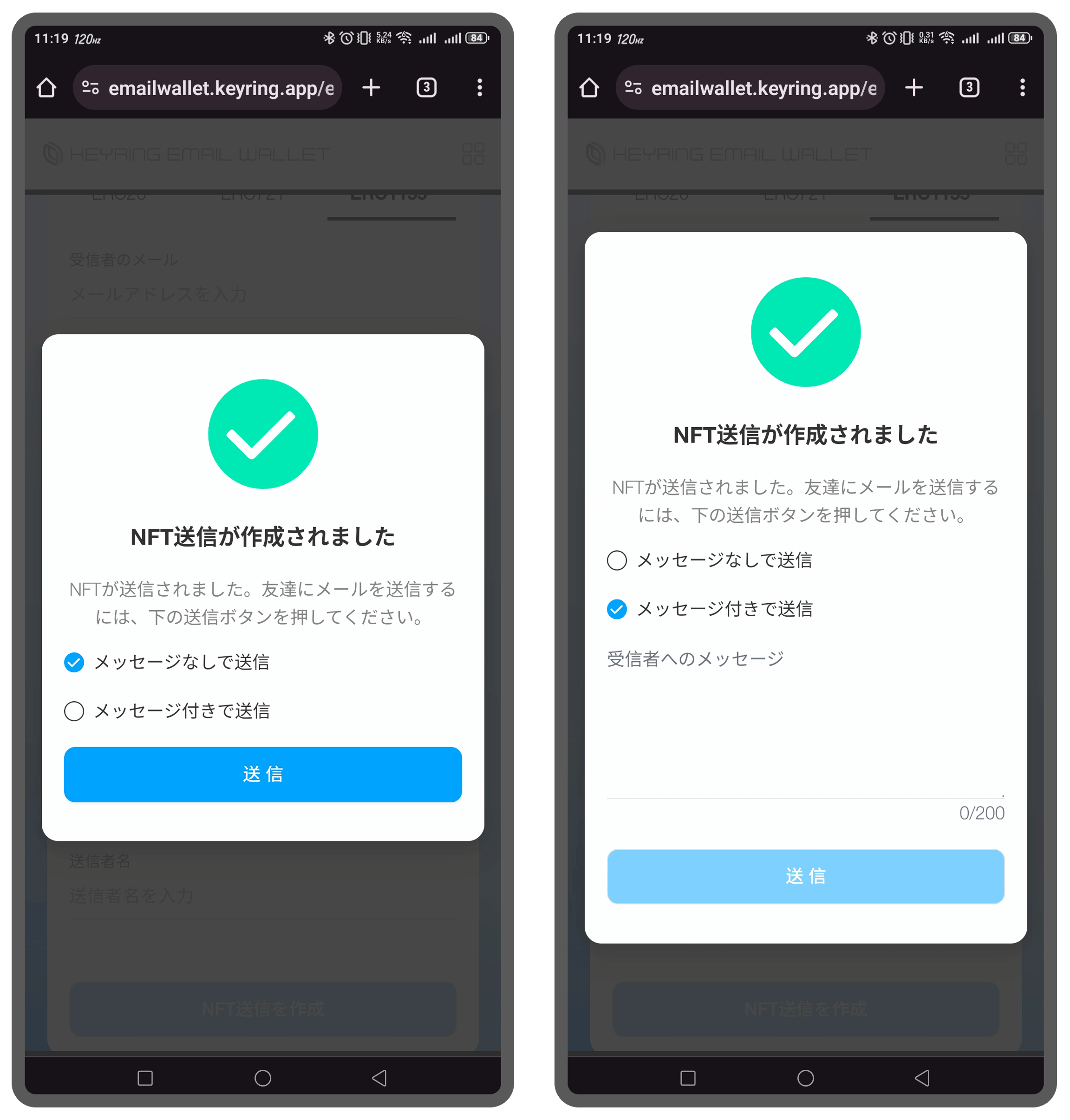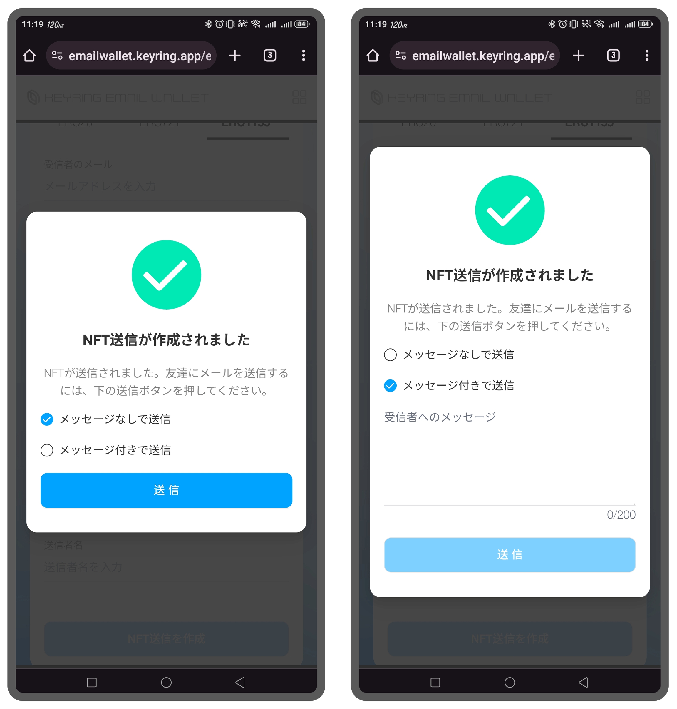メッセージなしで送信:このオプションを選択すると、メッセージなしでNFTを受信者のメールに直接送信できます。このオプションを選択し、「Send」をクリックして取引を完了します。
