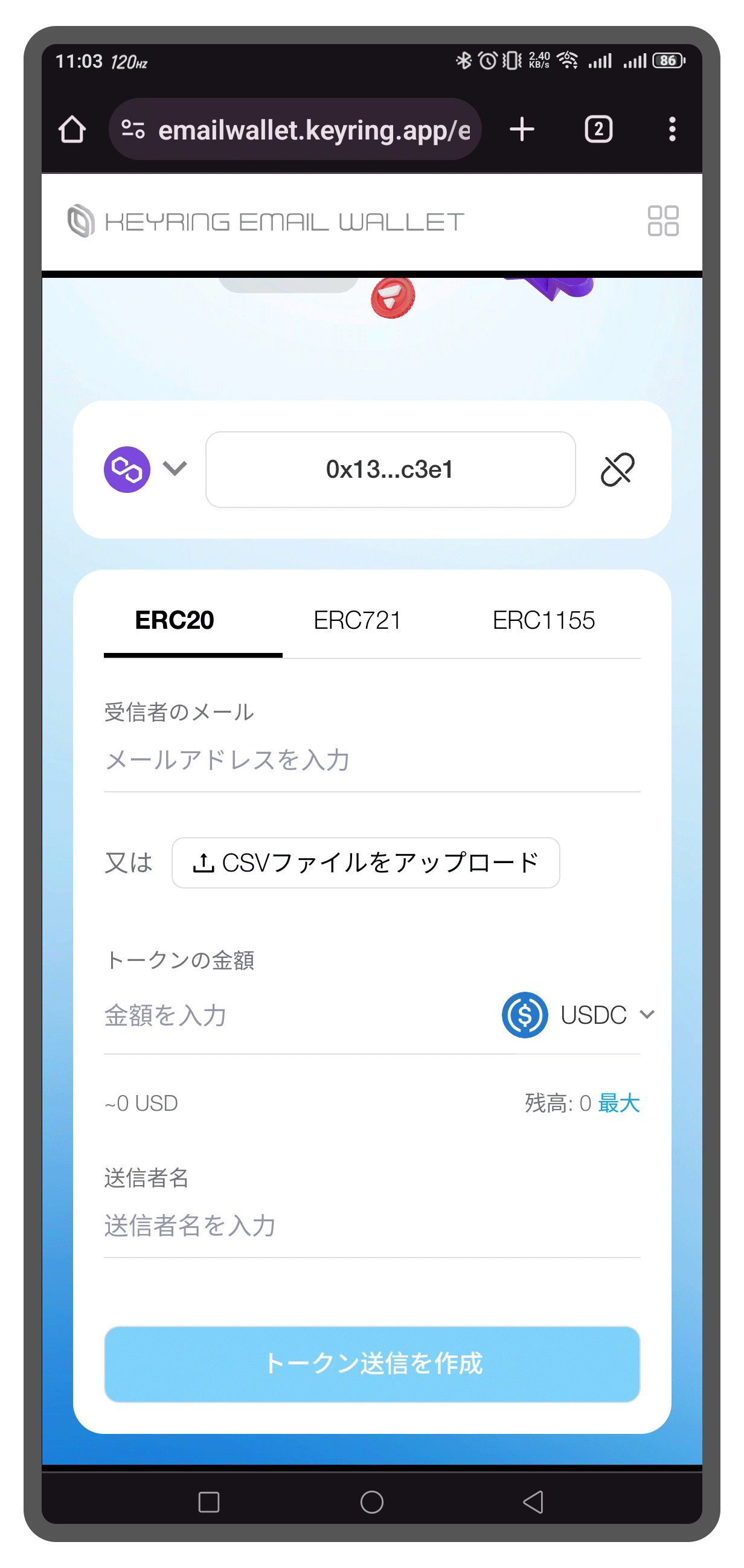 受信者のメールアドレスを入力します。ERC-721のNFTの場合、一度に1つのメールアドレスにしか送信できないため、複数のメールに送信するためのCSVファイルのアップロードオプションはありません。