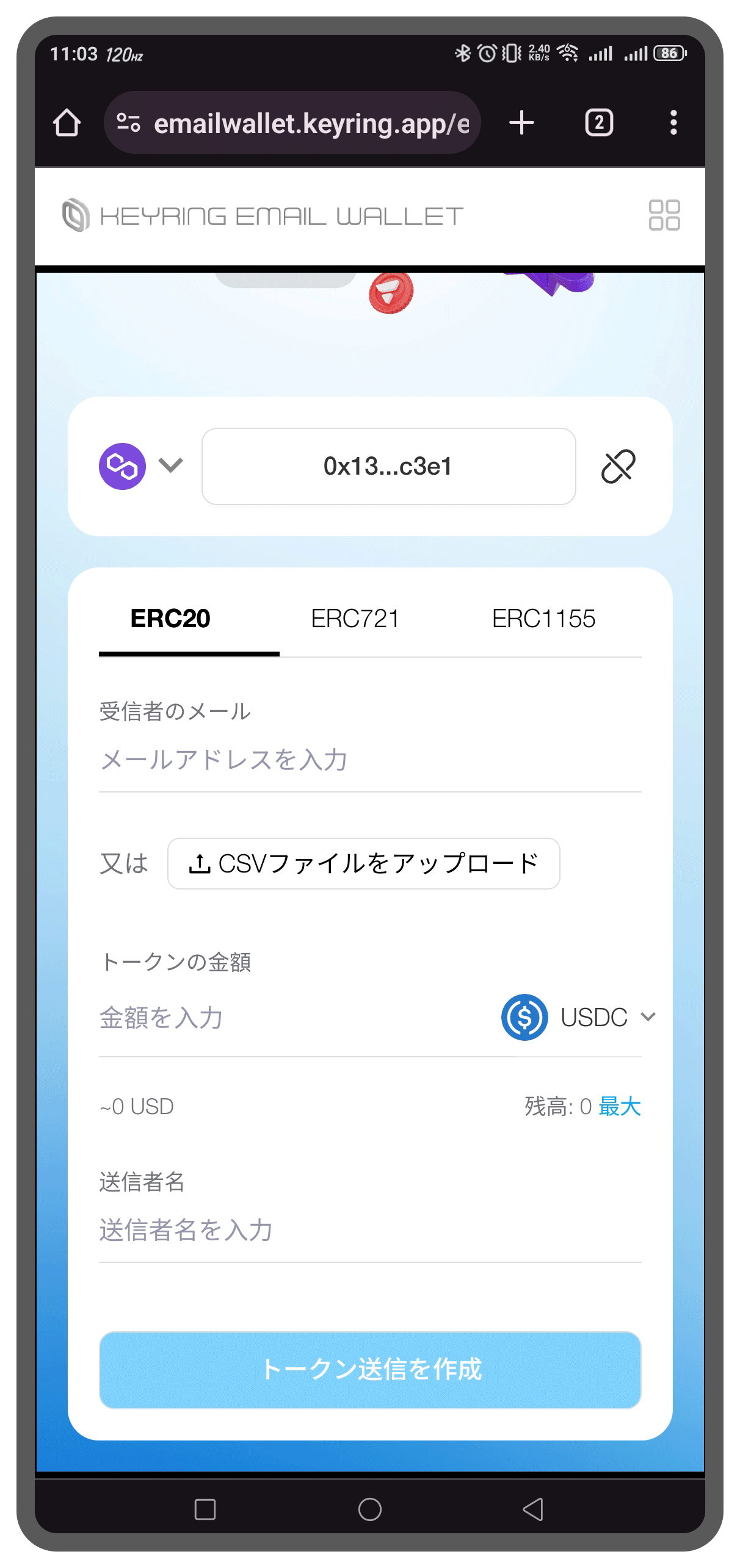 受信者のメールアドレスを入力します。複数のメールに送信する場合は、ERC-20プロセスと同様にメールリストが含まれたCSVファイルをアップロードします。