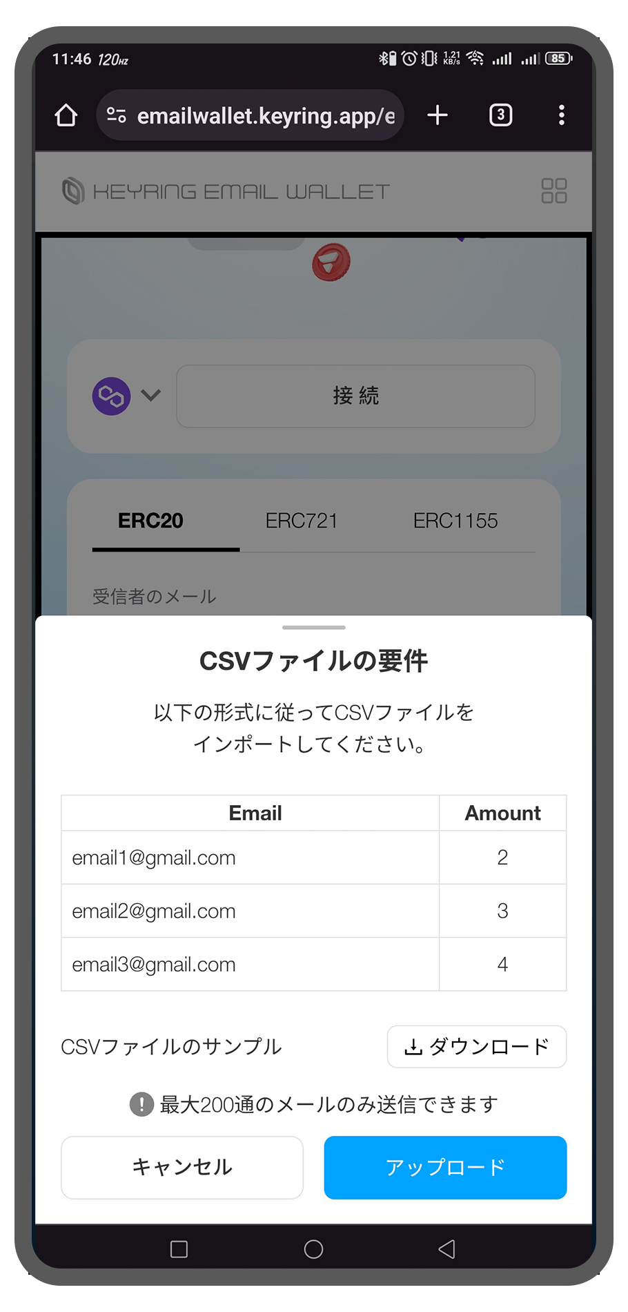 そのため、ERC-721トークンの「受信リンク」を作成する際には、送信者は1回のメールアドレスに対して1つのNFTしか送信できません。ERC-721タブでは、CSVファイルを使用して複数のメールアドレスに送信することはサポートされていません。