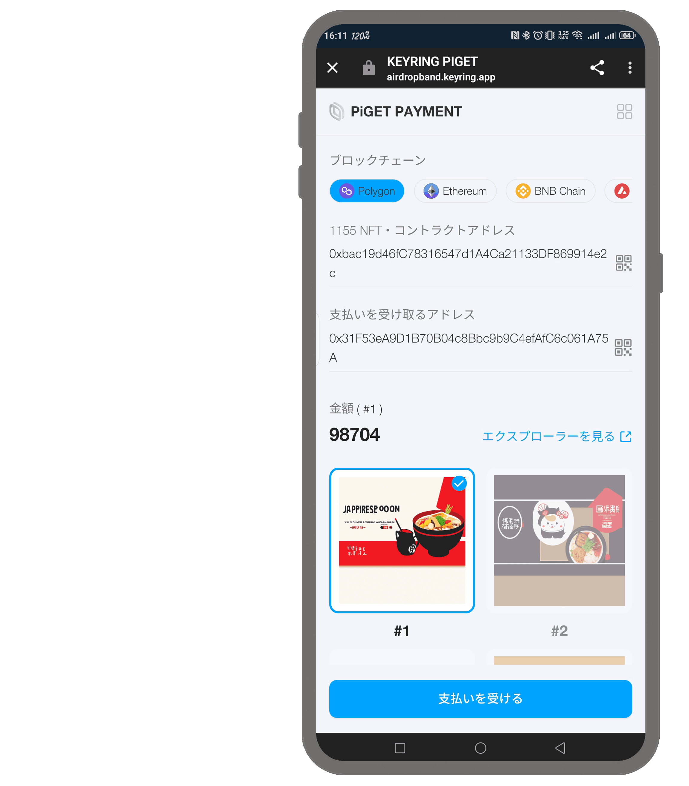 KEYRING PiGET PaymentはNFTを有効な支払い方法として受け入れますが、支払いに利用できる具体的なNFTはショップのオーナーや売り手によって決定されます。