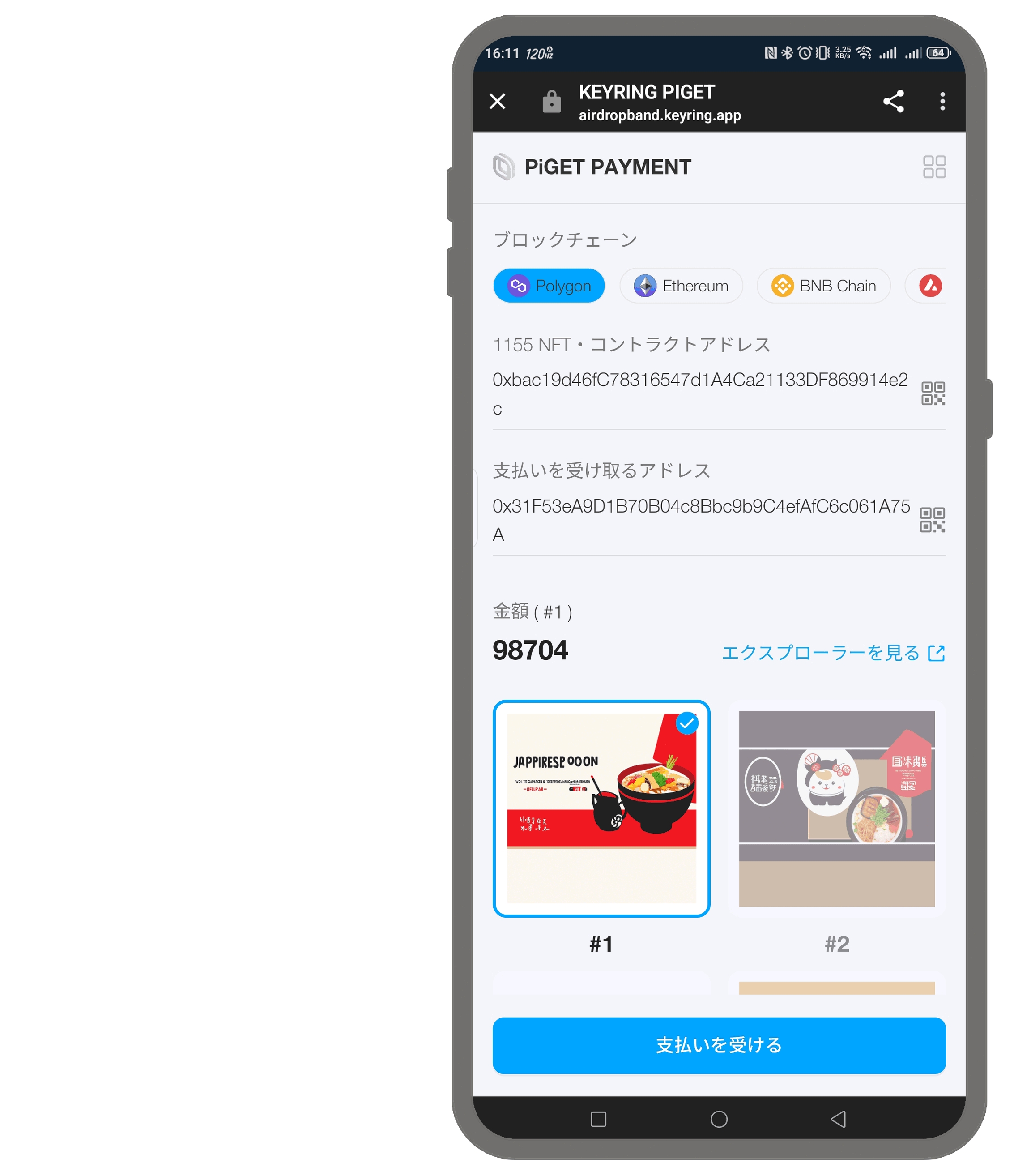 KEYRING PiGET Paymentは現在、ERC-20とERC-1155の2種類のトークンのみを受け入れています。