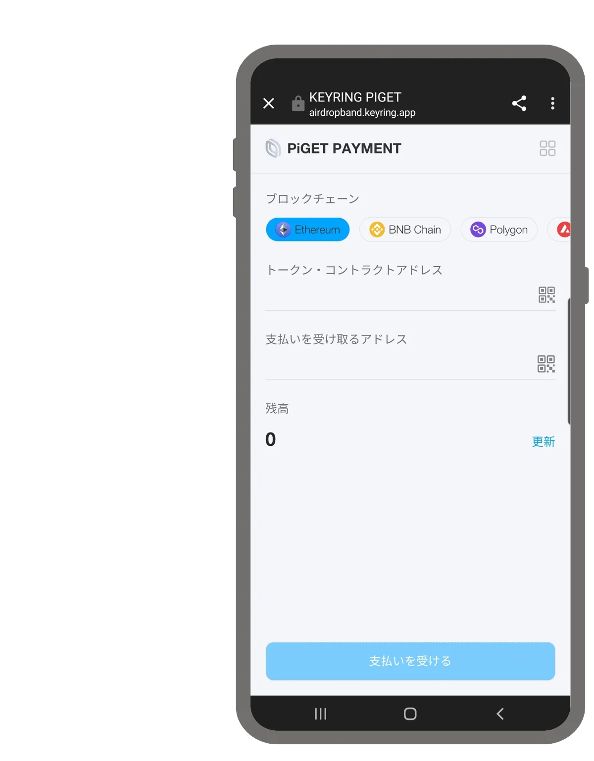 ERC-20トークン: これらのトークンを受け取るために、特定のトークンアドレス(例: ETH、USDT、MATICなど)を入力します。