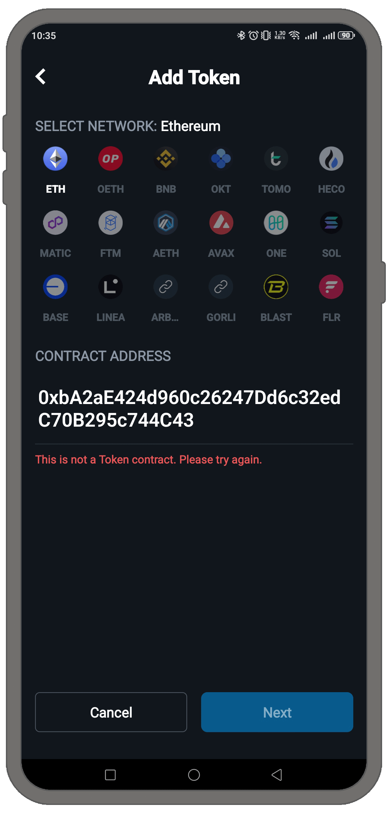 これにはいくつかの理由が考えられます。例えば、コントラクトを入力する際に間違いがあった場合です。 ただし、最も可能性が高いのは、誤ったチェーンが選択されたことです。正しいチェーンを選択すると、エラーは表示されなくなり、トークンの追加が続けられるようになります。