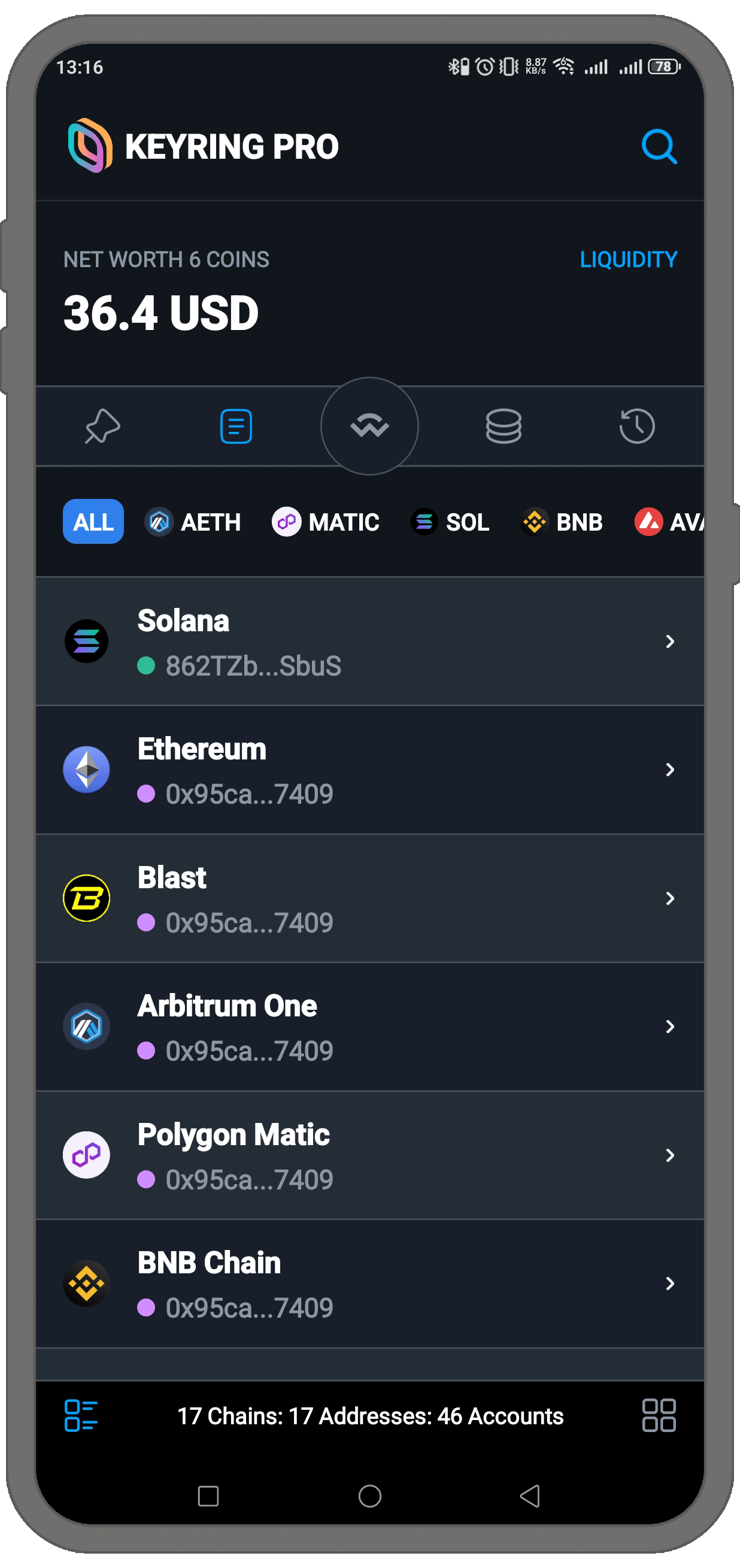 KEYRING PRO Walletでは、ユーザーが資産ページを更新してトークン残高を最新の状態にすることができます。 ただし、「ALL」フィルターを選択している場合、ページの更新は10分ごとに1回のみ可能です。 特定のチェーンでフィルターをかけた場合は、いつでも更新できます。