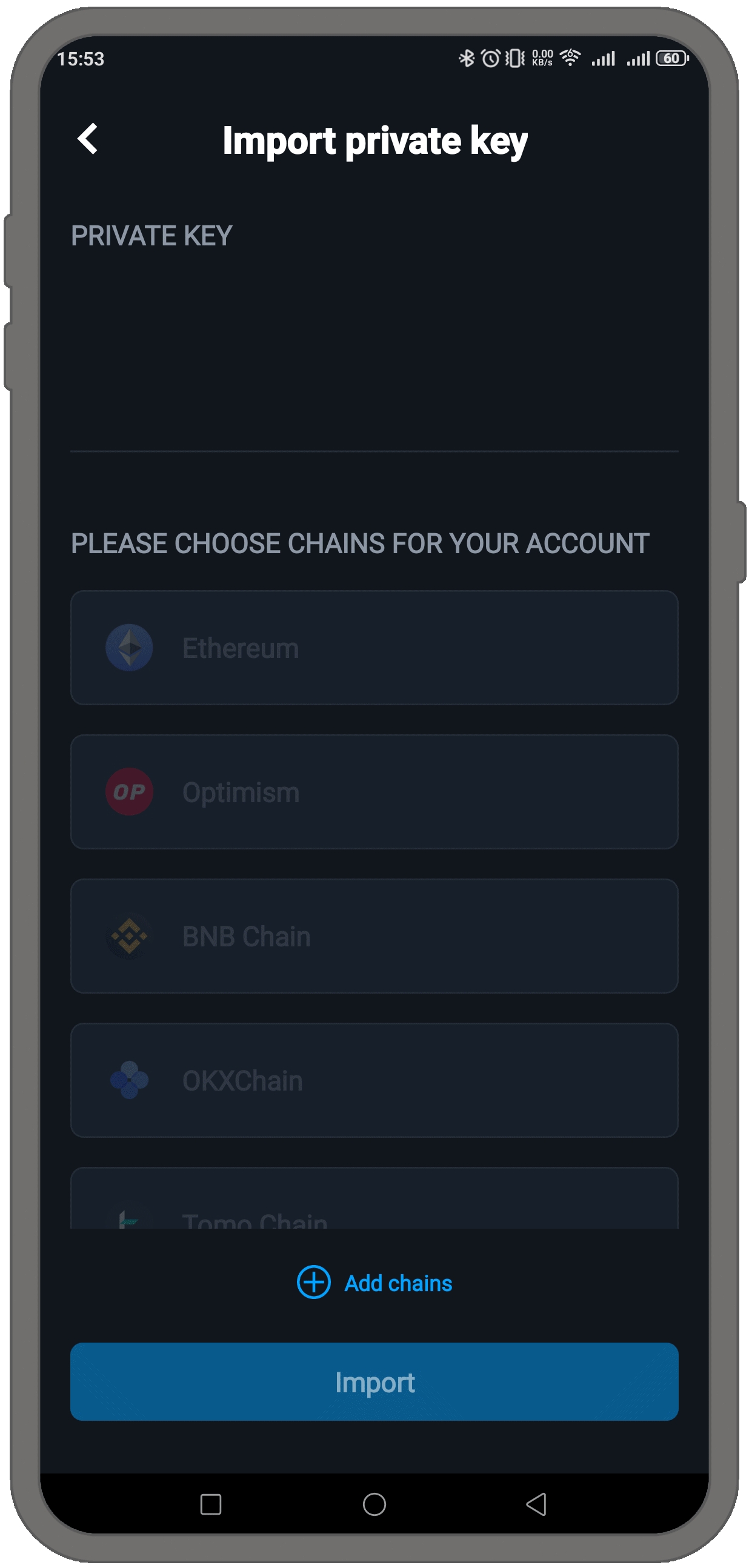 プライベートキーを入力し、アカウント用のブロックチェーンを選択します。