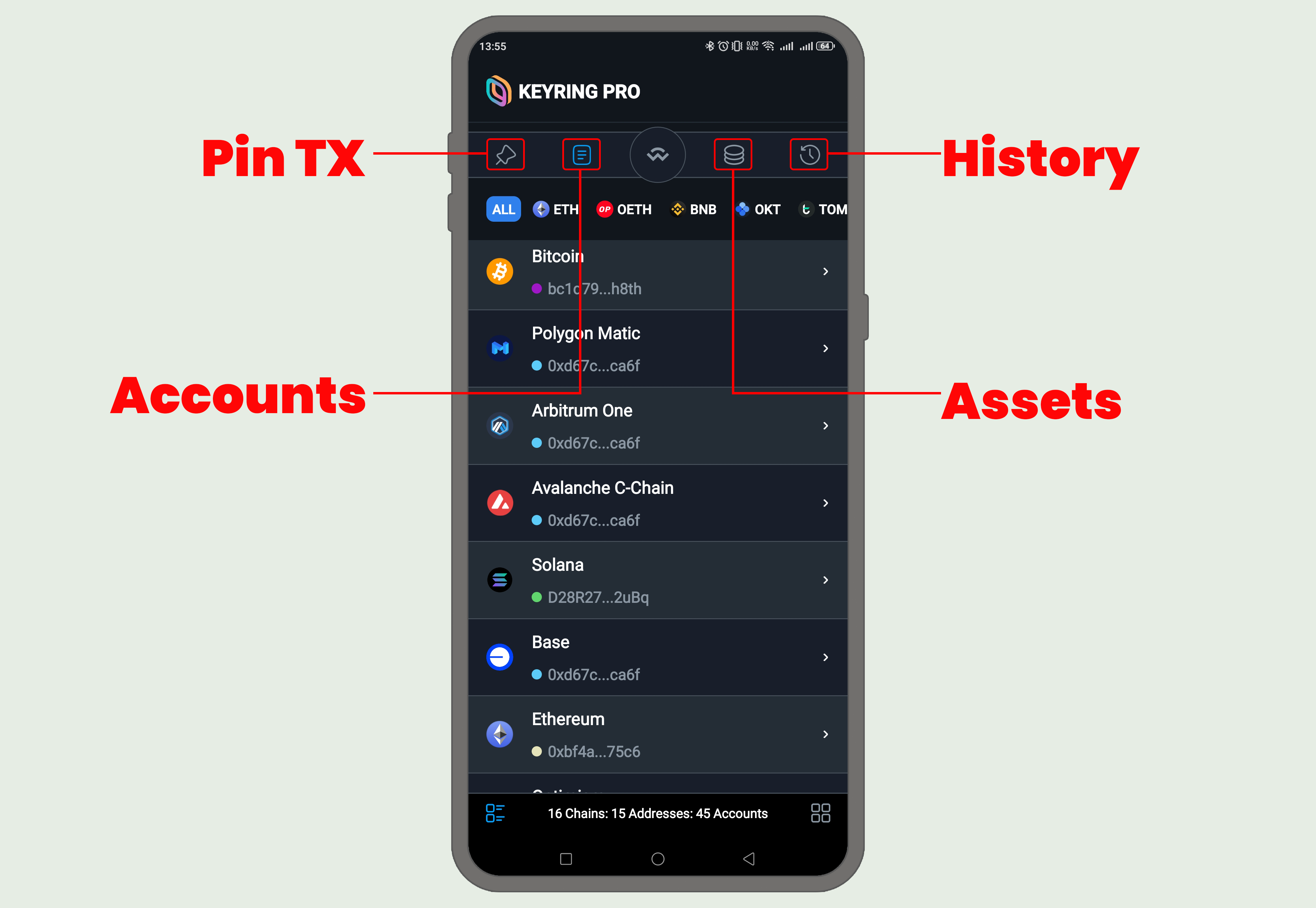 ユーザーがより簡単に操作できるように、KEYRING PROウォレットは基本的なガイドを提供しています。画面右上の検索アイコンをタップすると、アプリの最も一般的かつ重要な操作に関するガイドが見つかります。