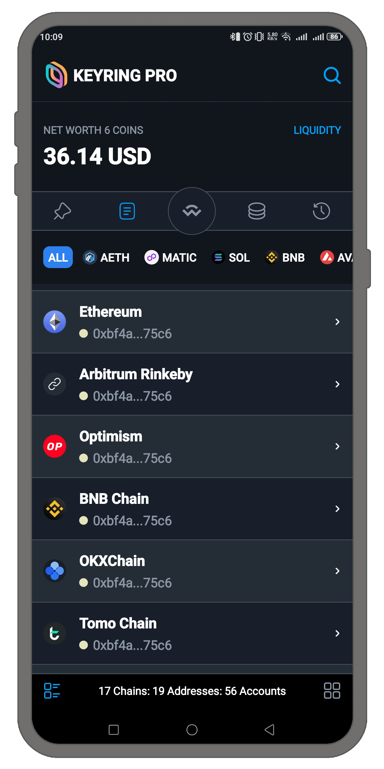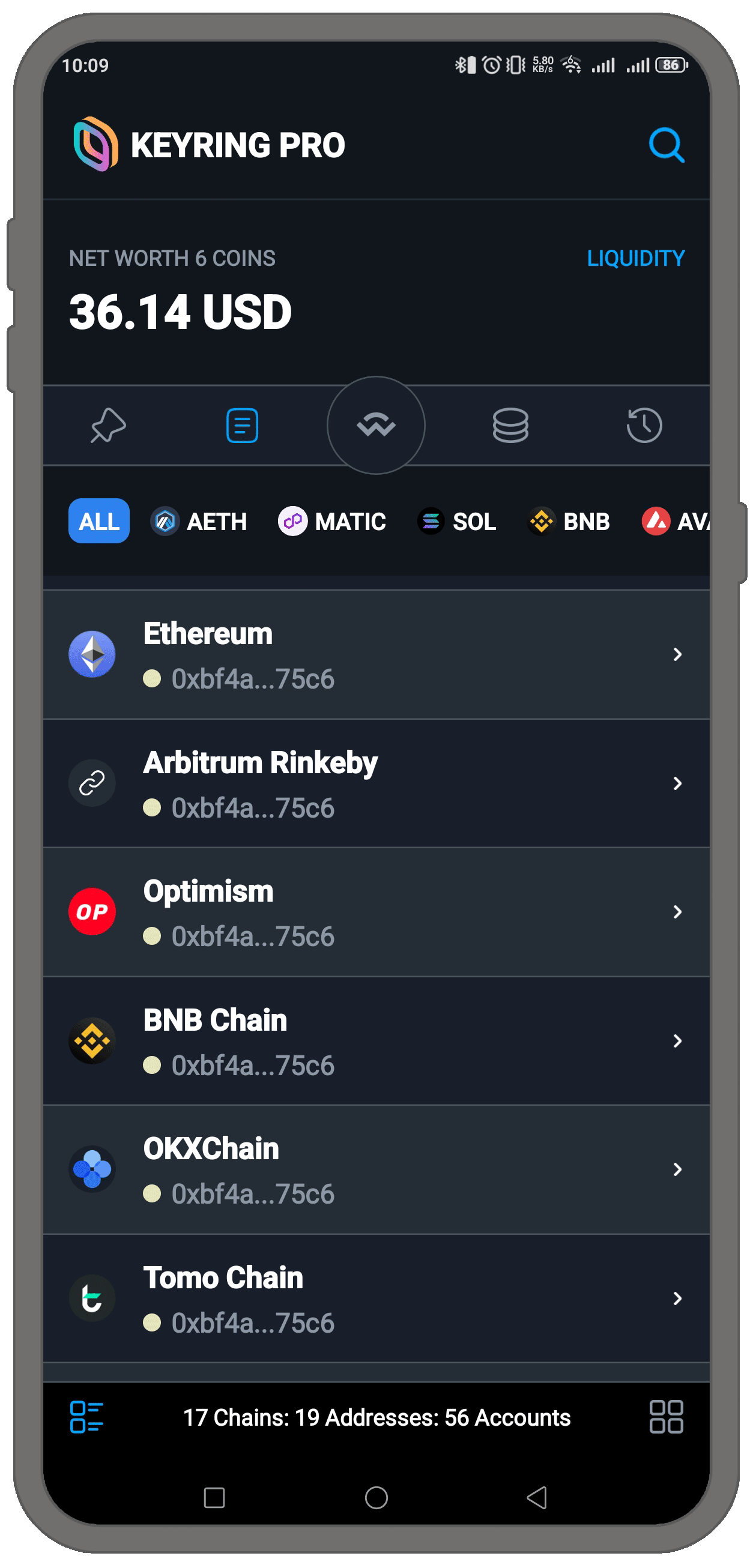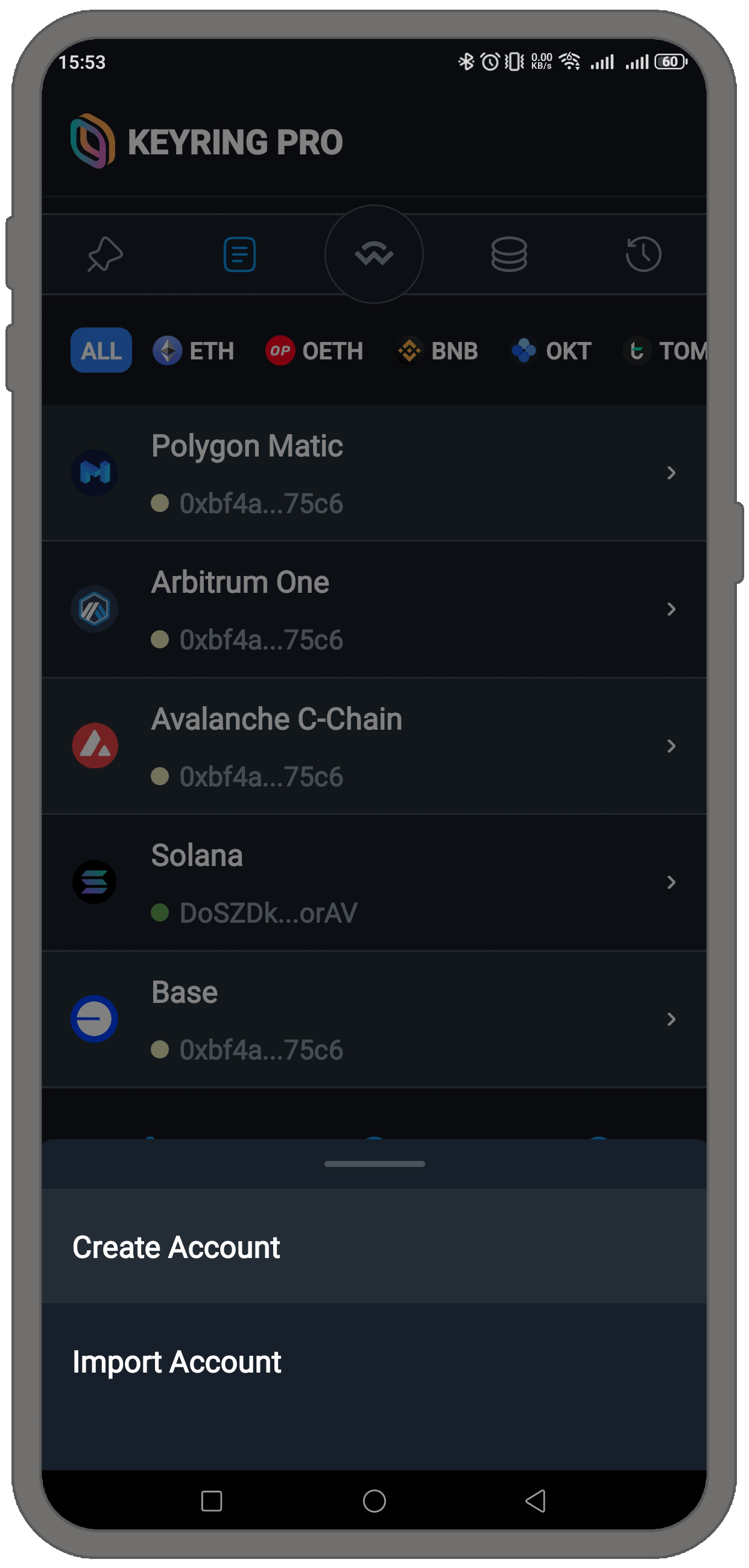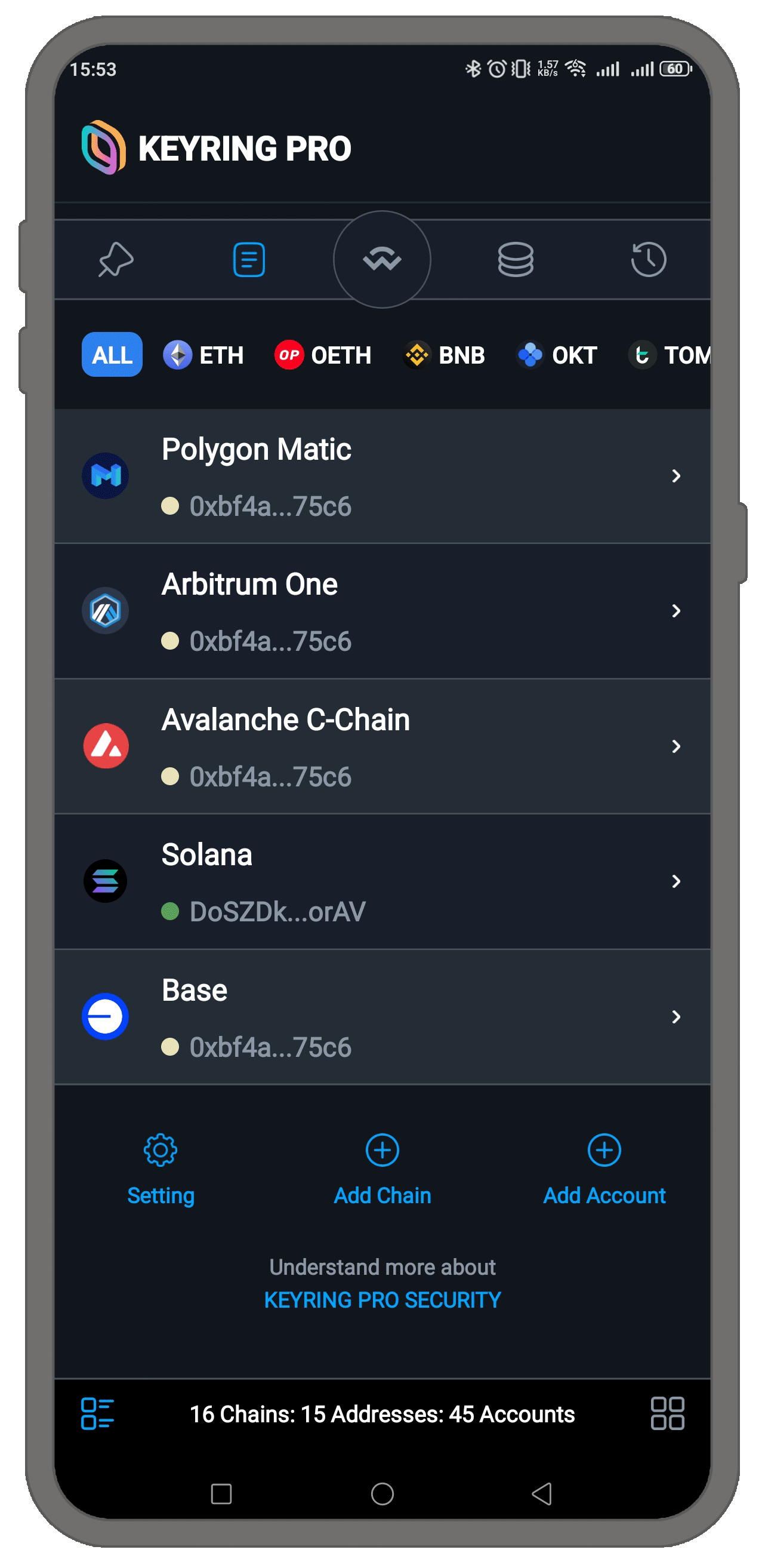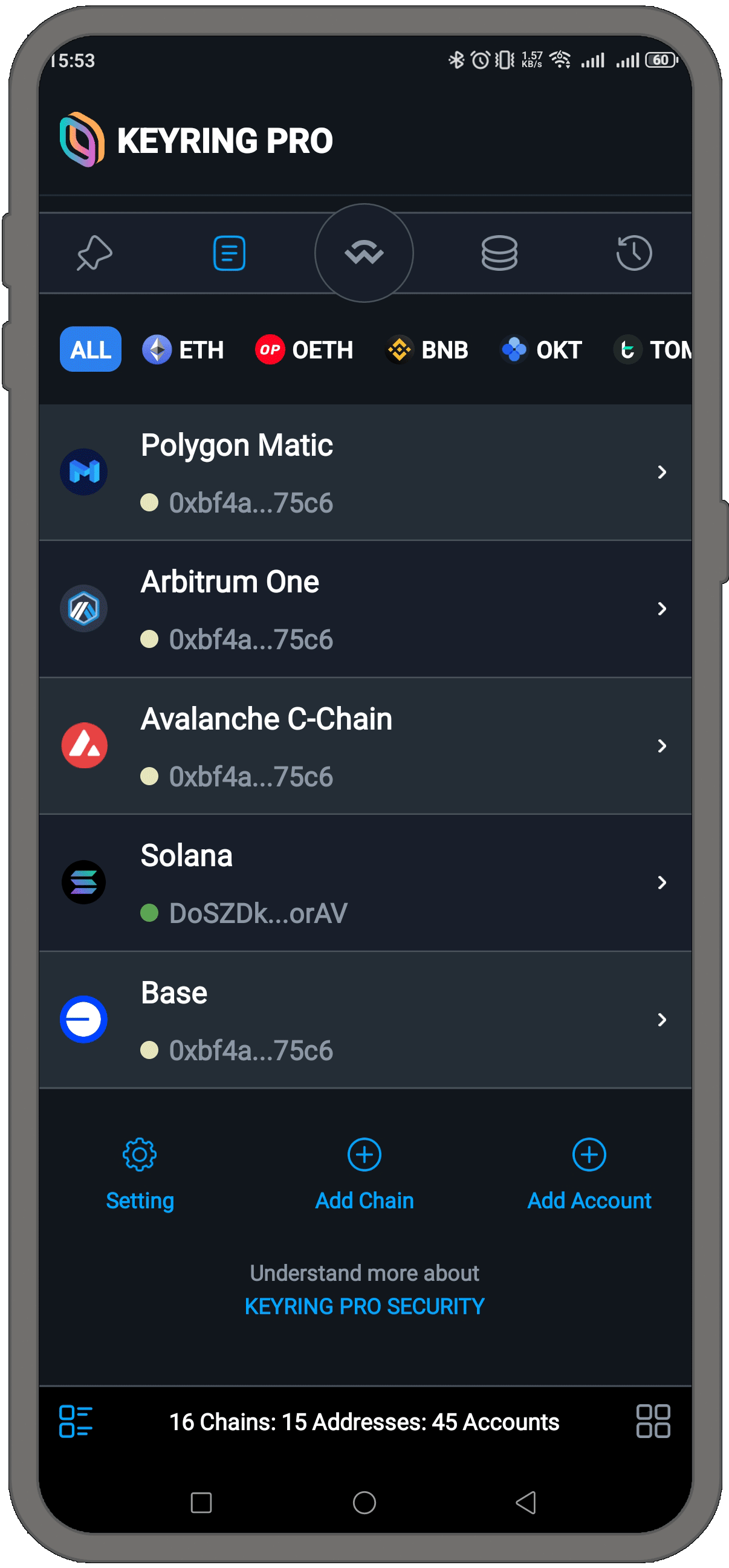 KEYRING PROウォレットでは、同じプライベートキーの下で複数のチェーン上にウォレットを作成できます。所有するウォレットアドレスを確認するには、アカウントタブに移動します。