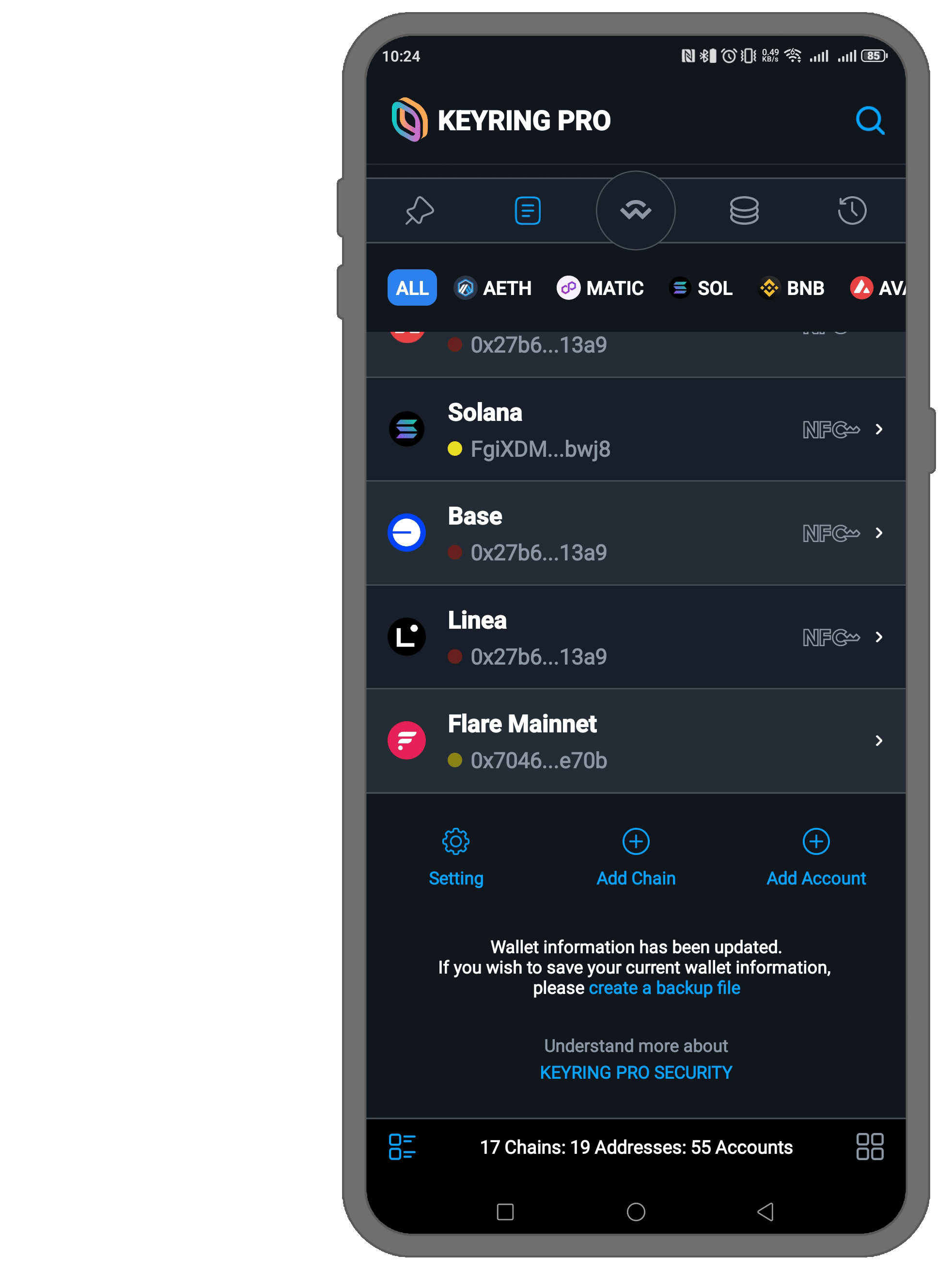 KEYRING PROウォレットでは、新しいチェーンを簡単に追加でき、ウォレットを作成してシームレスに使用することが可能です。