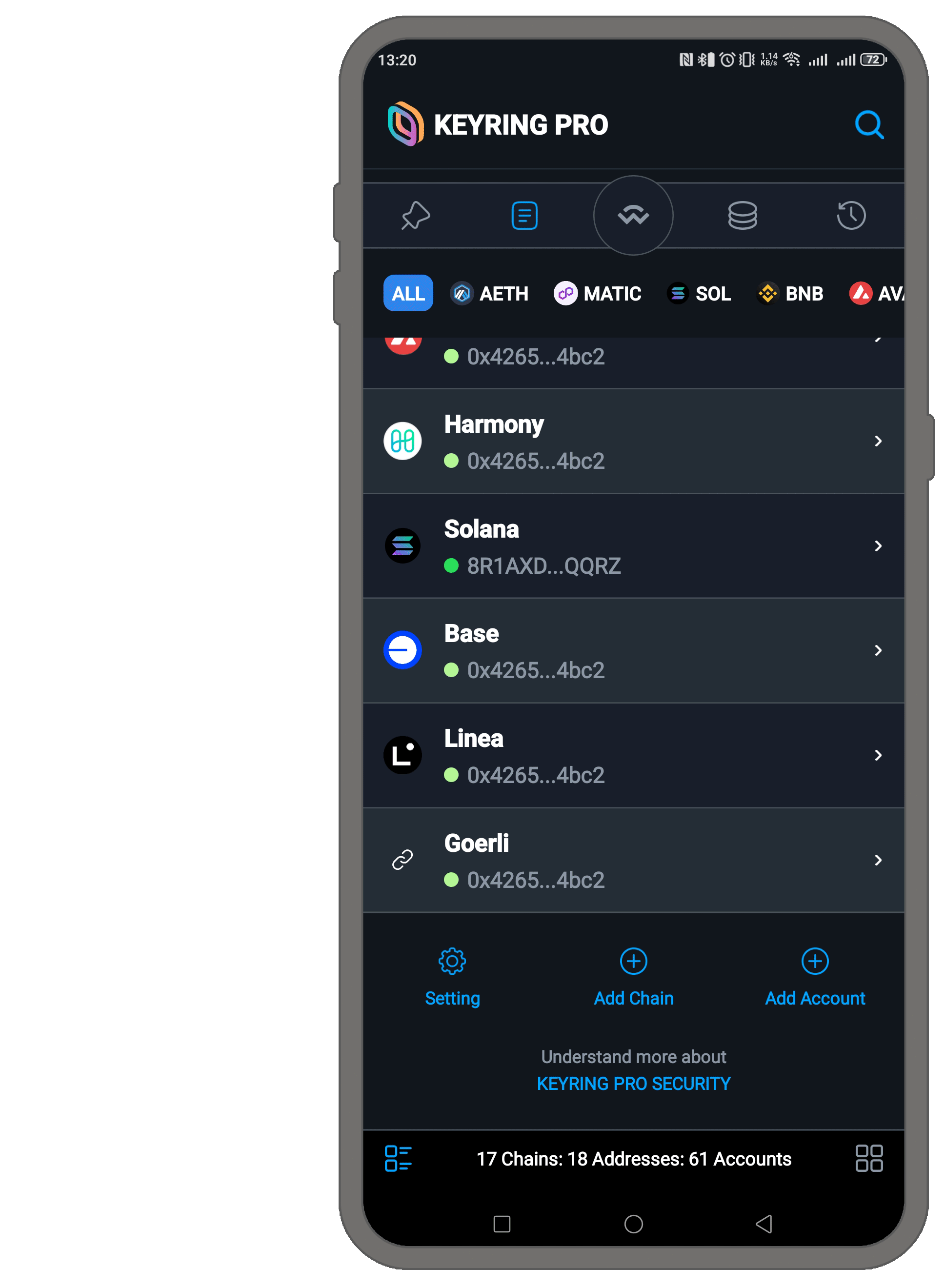 KEYRING PROウォレットでは、同じプライベートキーを使用して、異なるチェーンにわたる同じウォレットアドレスを持つ複数のアカウントを作成できます。使用しないチェーンのアカウントがある場合は、整理のために簡単に削除できます。