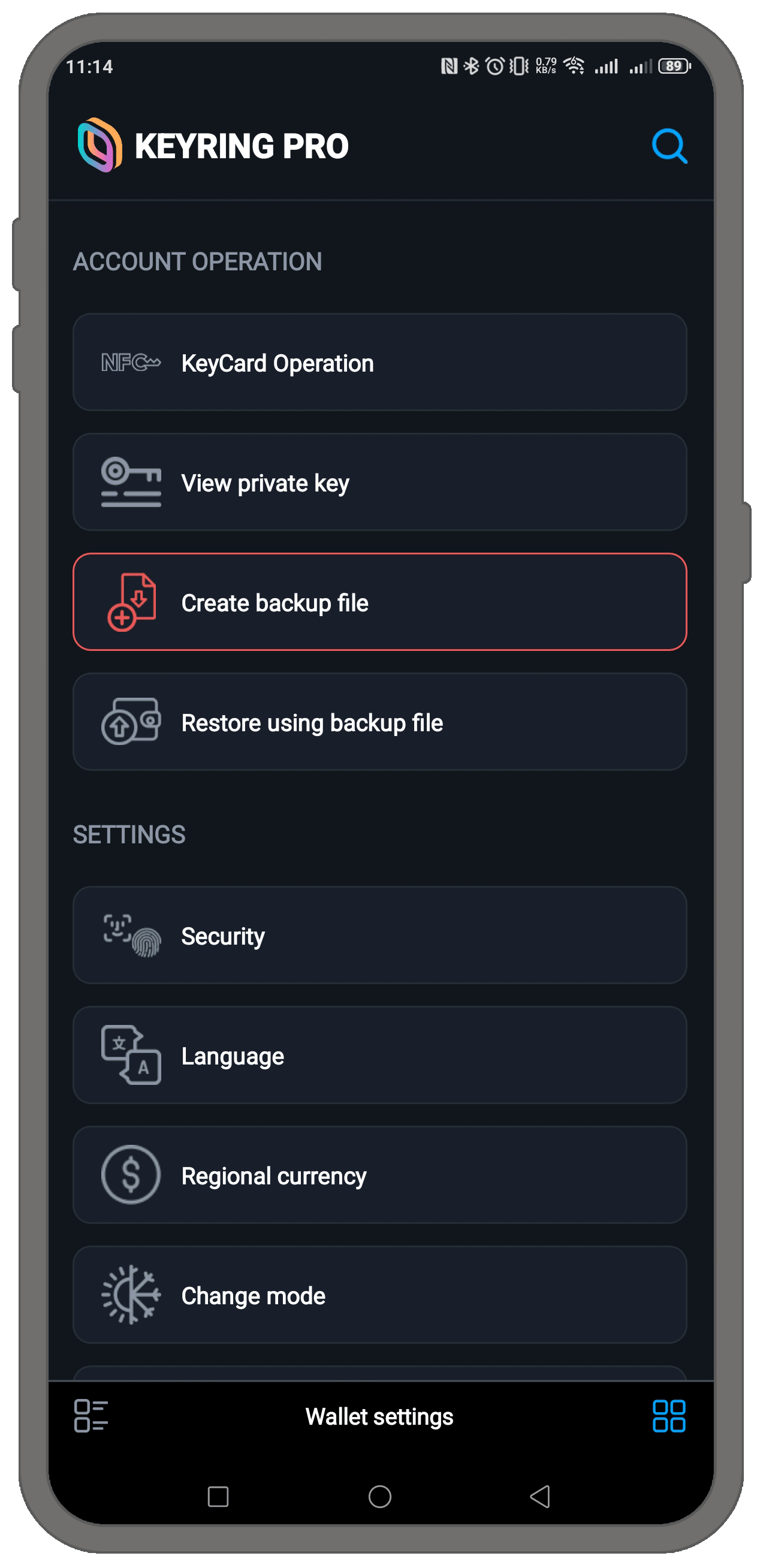 1. **ウォレット設定**に移動します（右下の四角いアイコンをタップ）。