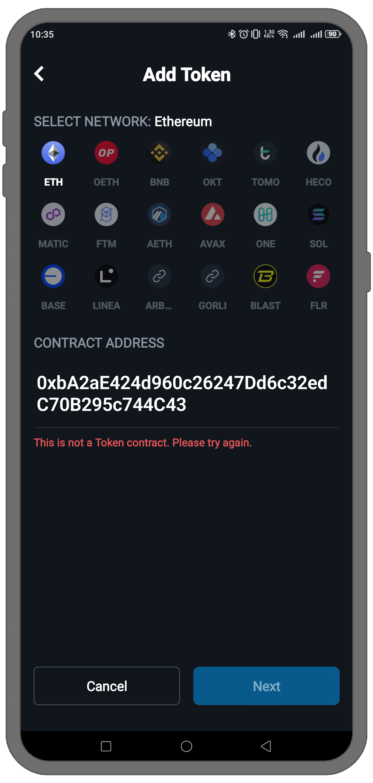 However, the most likely reason is that the wrong chain was selected. Once you select the correct chain, the error should no longer appear, and you can continue adding the token.