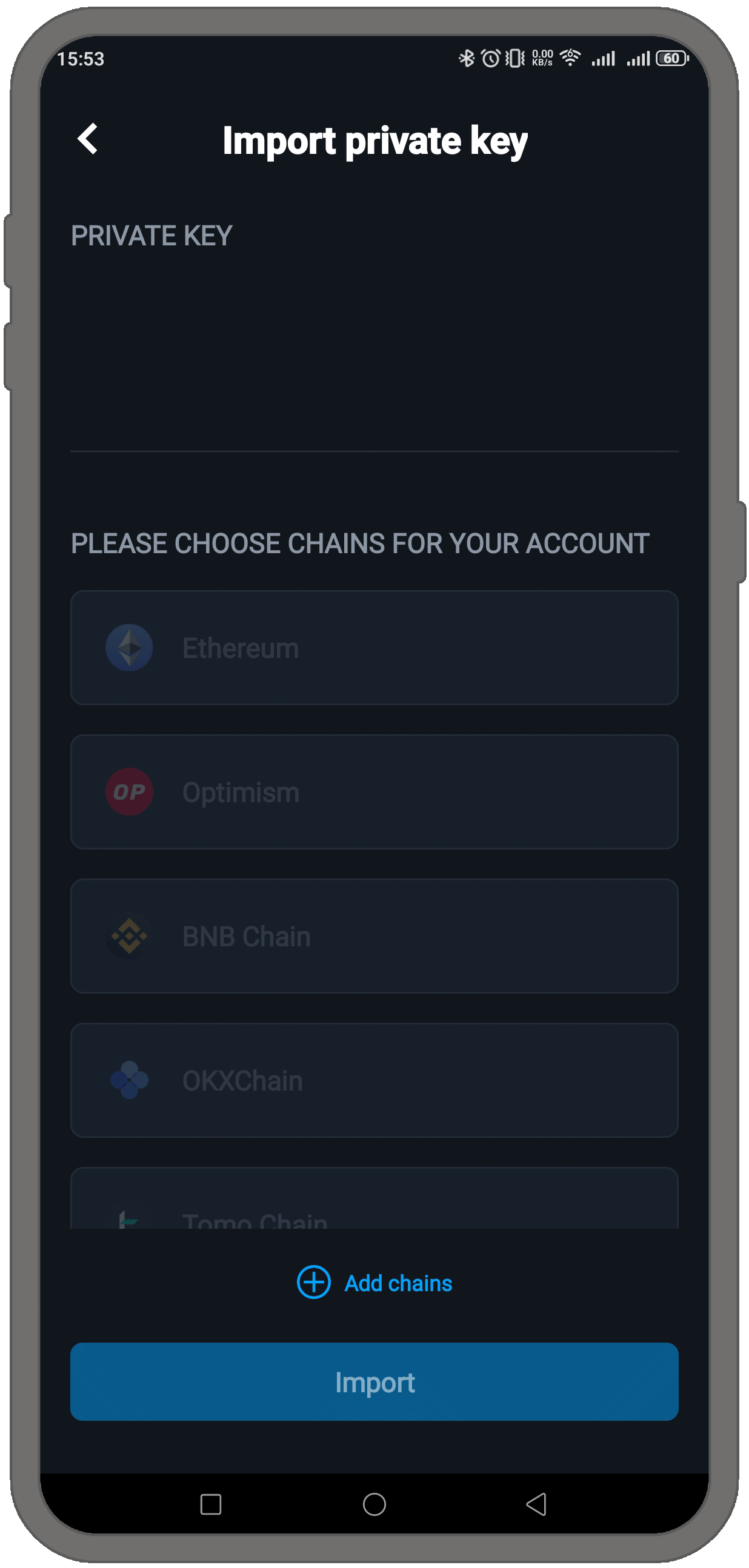 2. Input your Private Key and select the blockchain for your account.&#x20;