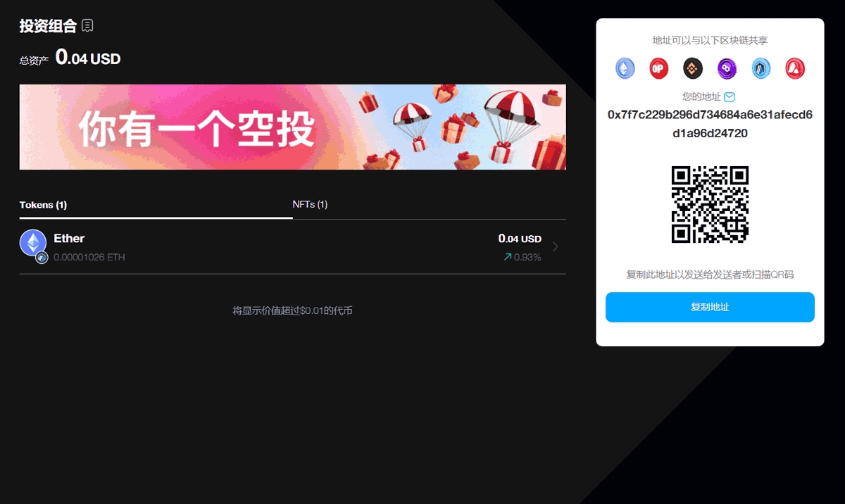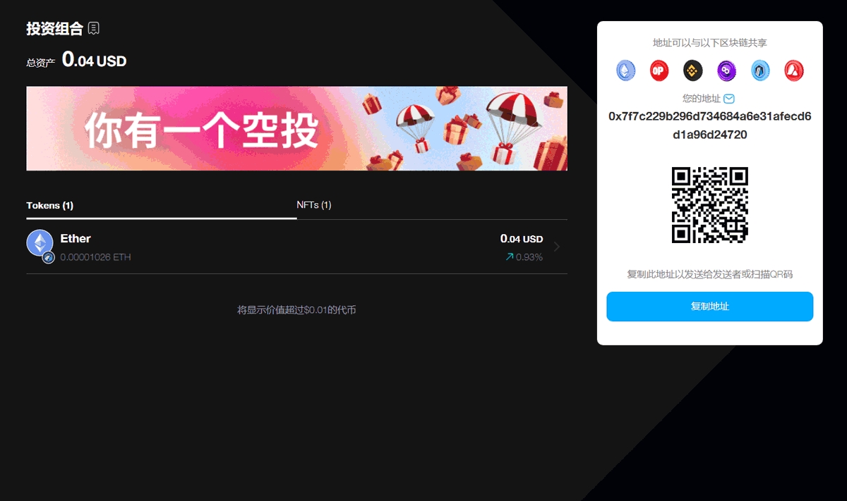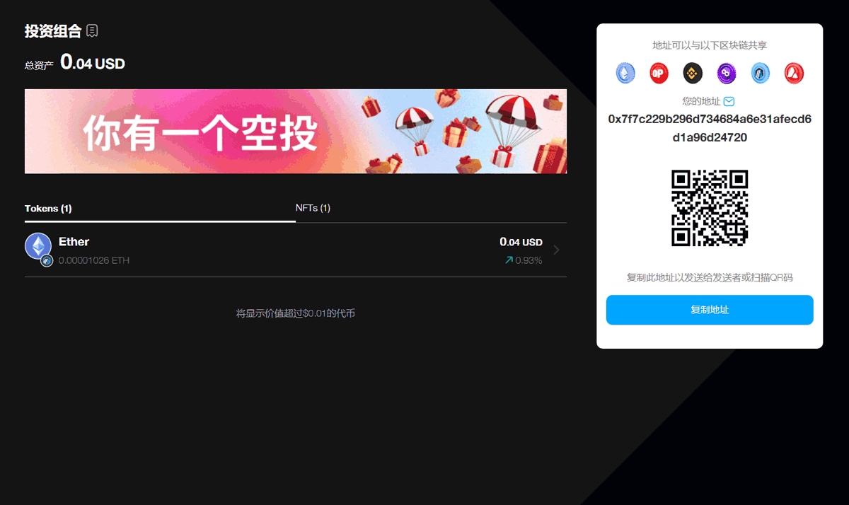 复制您的钱包地址并与发送者分享,或者让发送者直接扫描QR码。