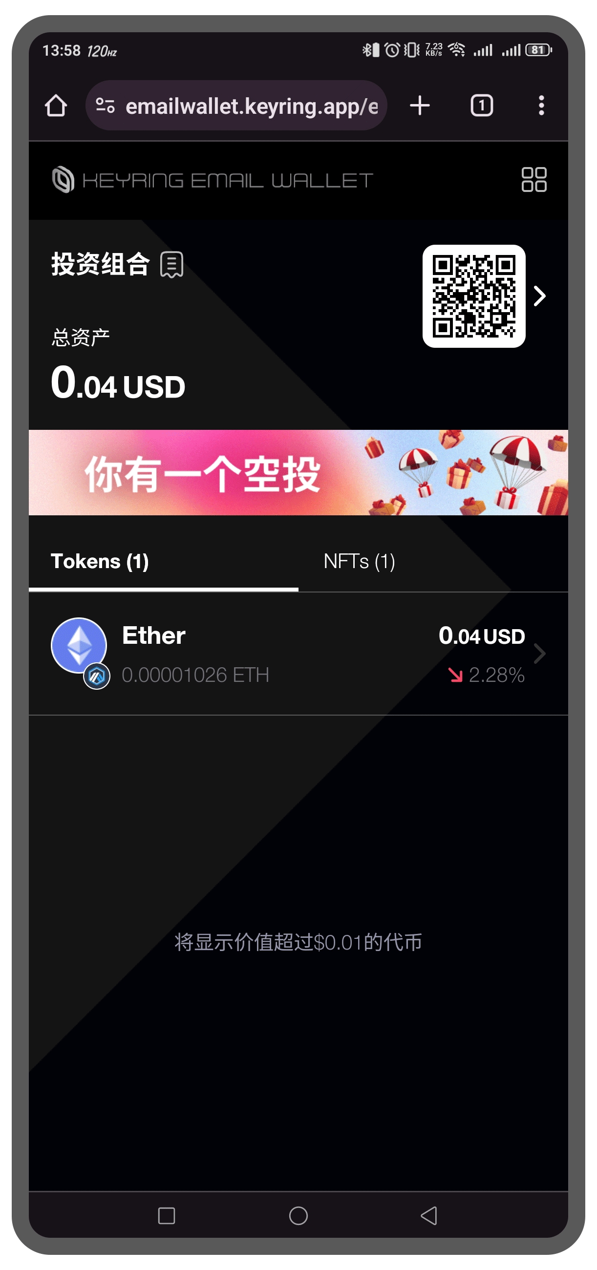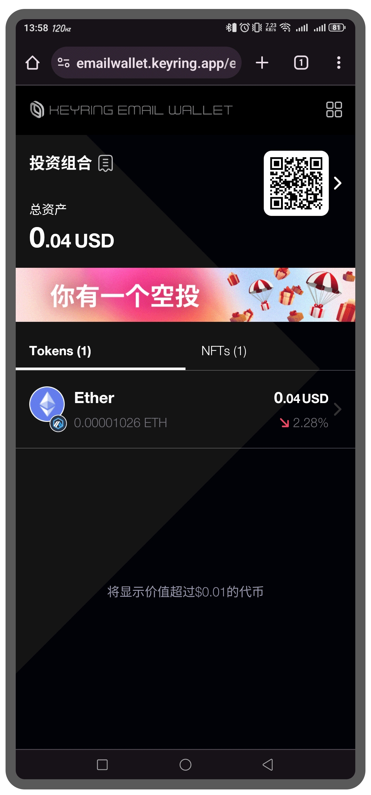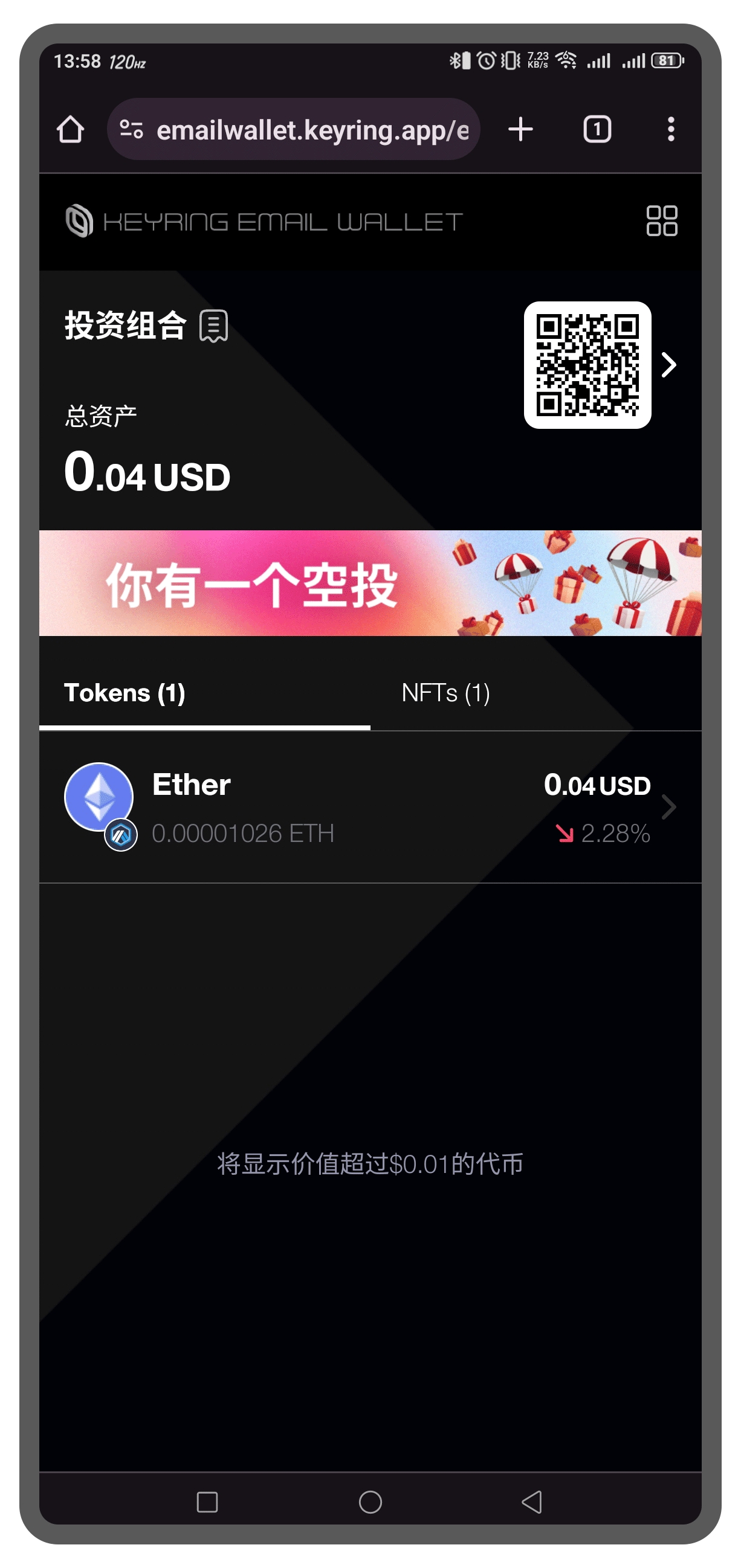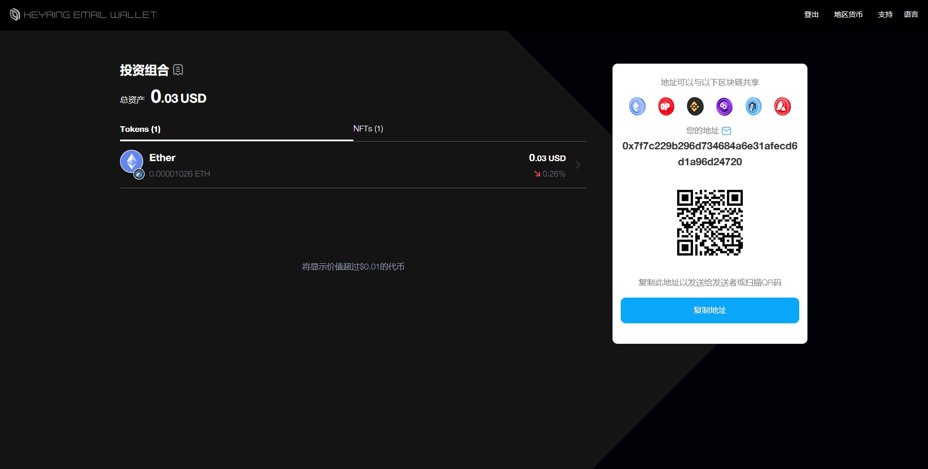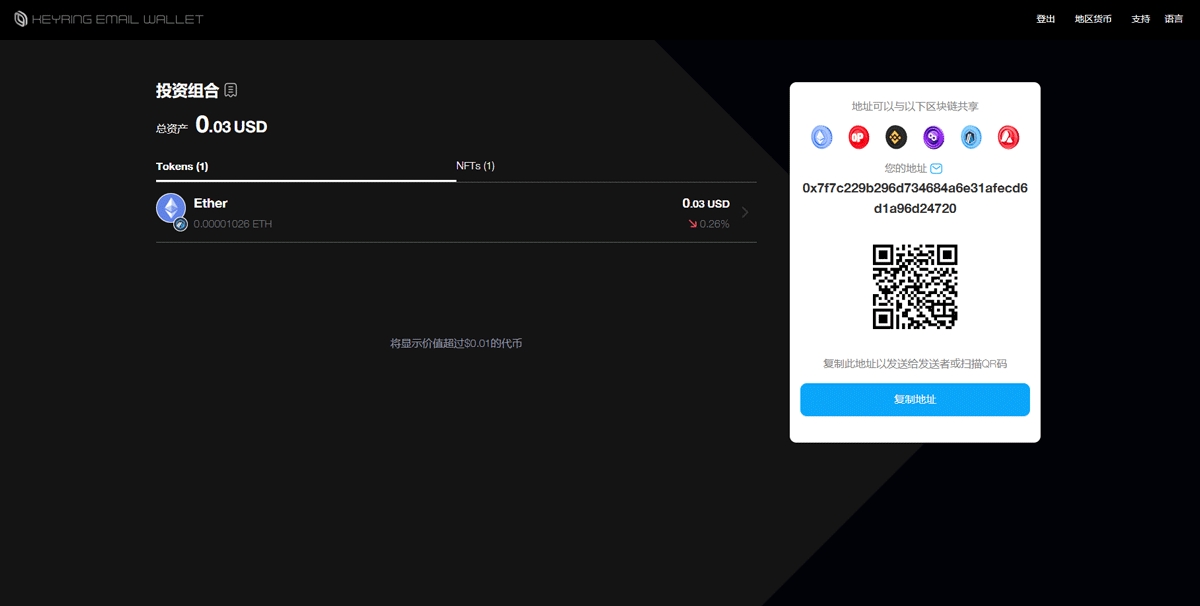 在KEYRING Email Wallet的主界面上,您将看到您的钱包地址以及一个QR码。