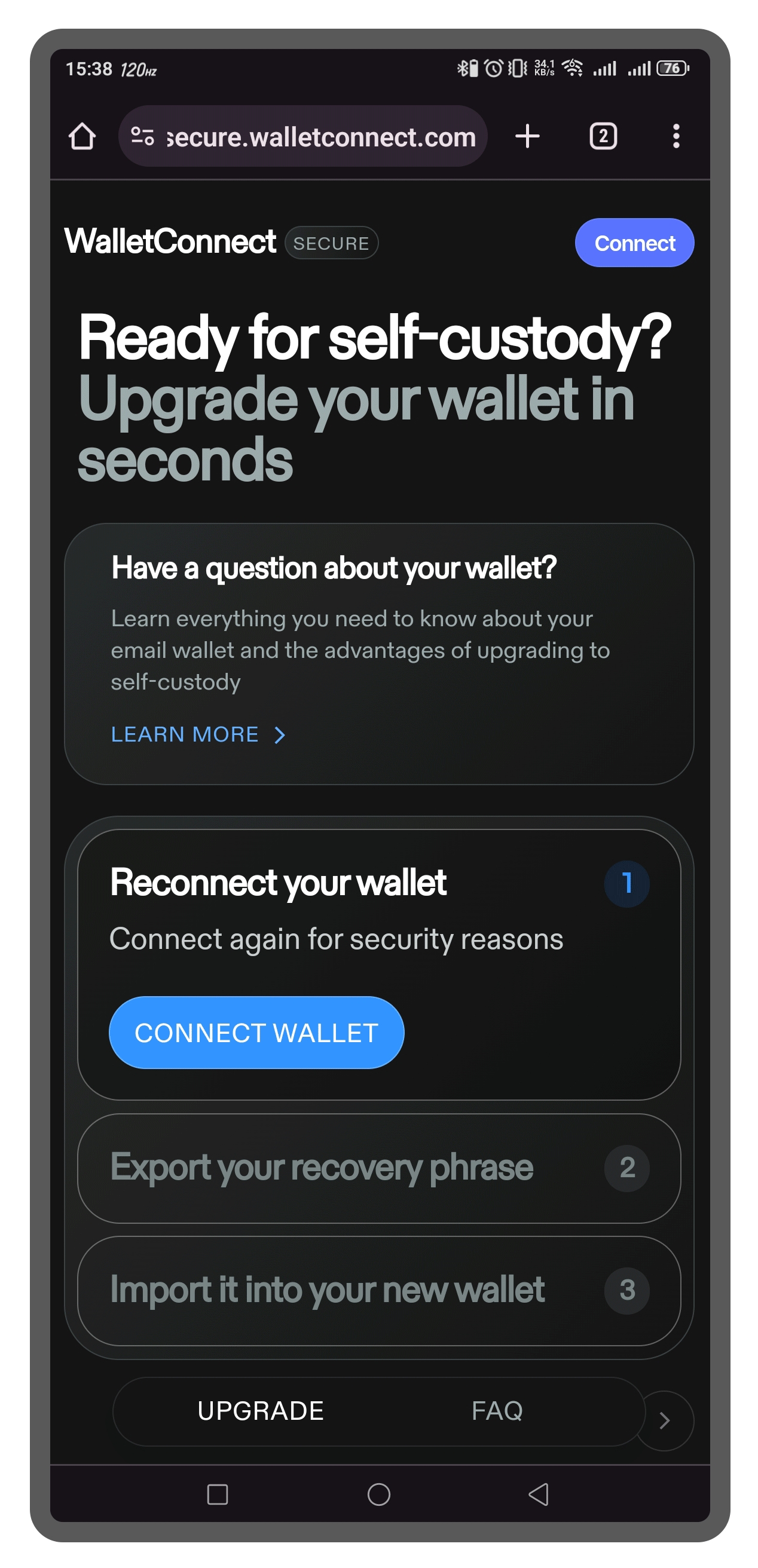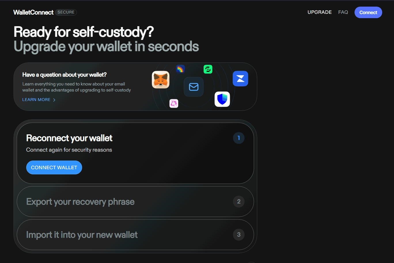 请注意,由于KEYRING Email Wallet利用Wallet Connect的基础设施帮助新用户快速熟悉钱包的使用,KEYRING Email Wallet无法保护恢复短语。这个安全责任属于Wallet Connect。