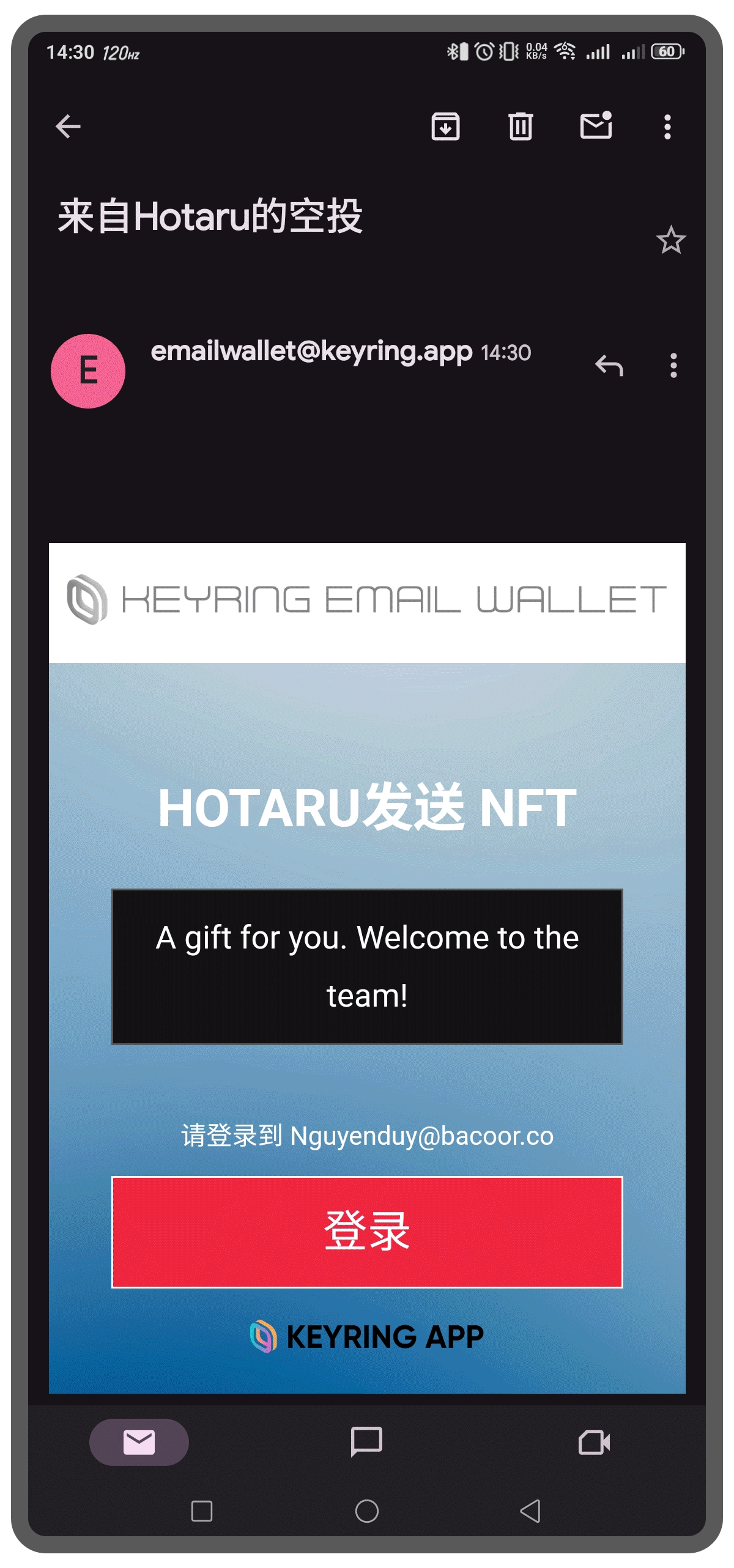 邮件详情:邮件中将显示发送者的信息、他们的消息(如果有)、您的电子邮件地址,以及一个链接到KEYRING Email Wallet登录页面的链接。
