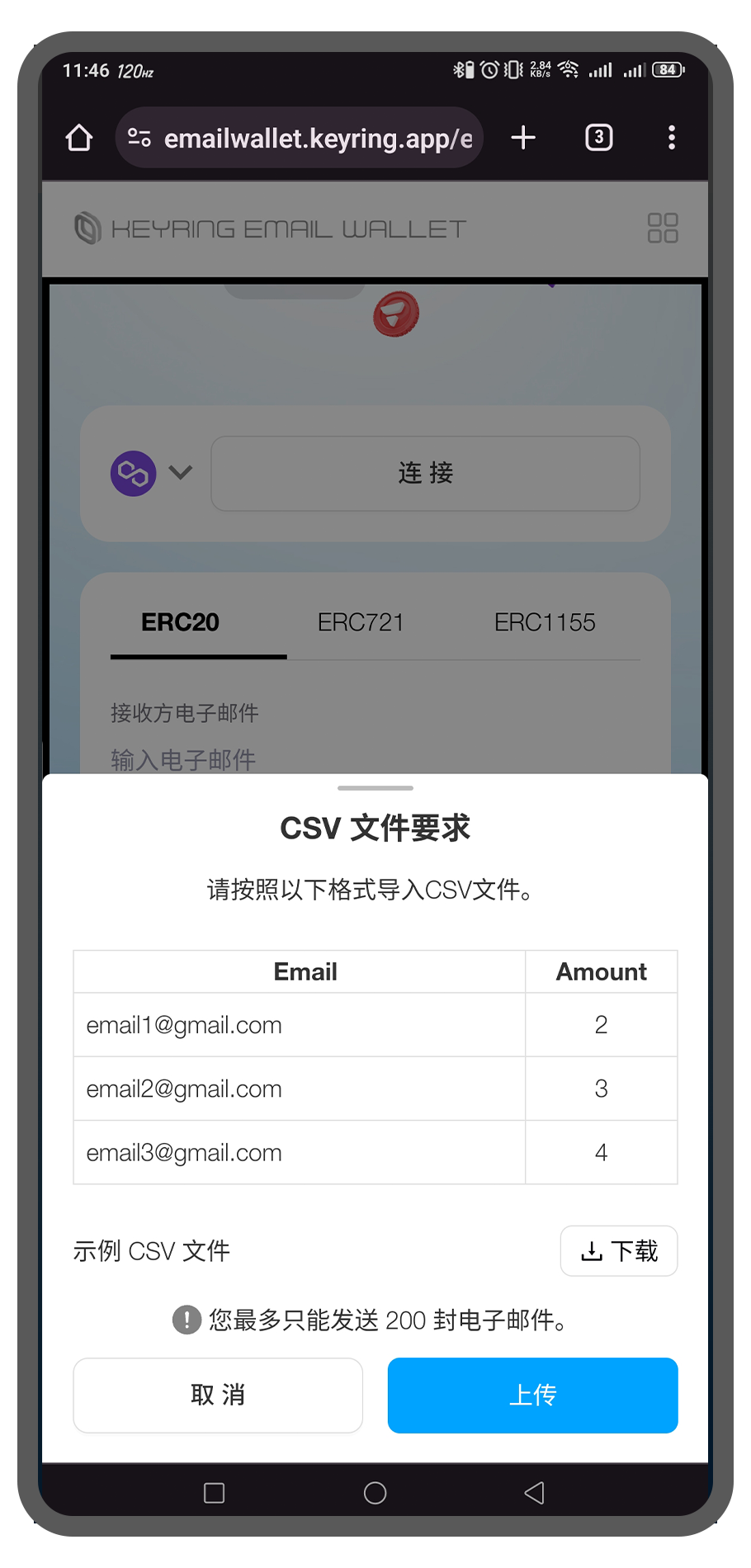 对于向多个电子邮件发送代币,您一次可以在一个批次中包含的电子邮件地址最大数量为200。如果需要发送到超过200个电子邮件,您需要将列表拆分成多个批次。