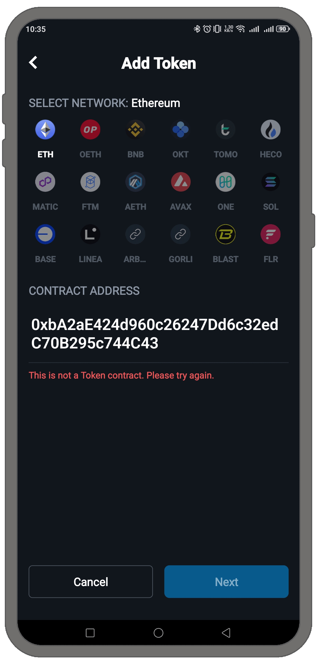 但最可能的原因是选择了错误的链。一旦选择了正确的链,错误应该不再出现,您可以继续添加代币。