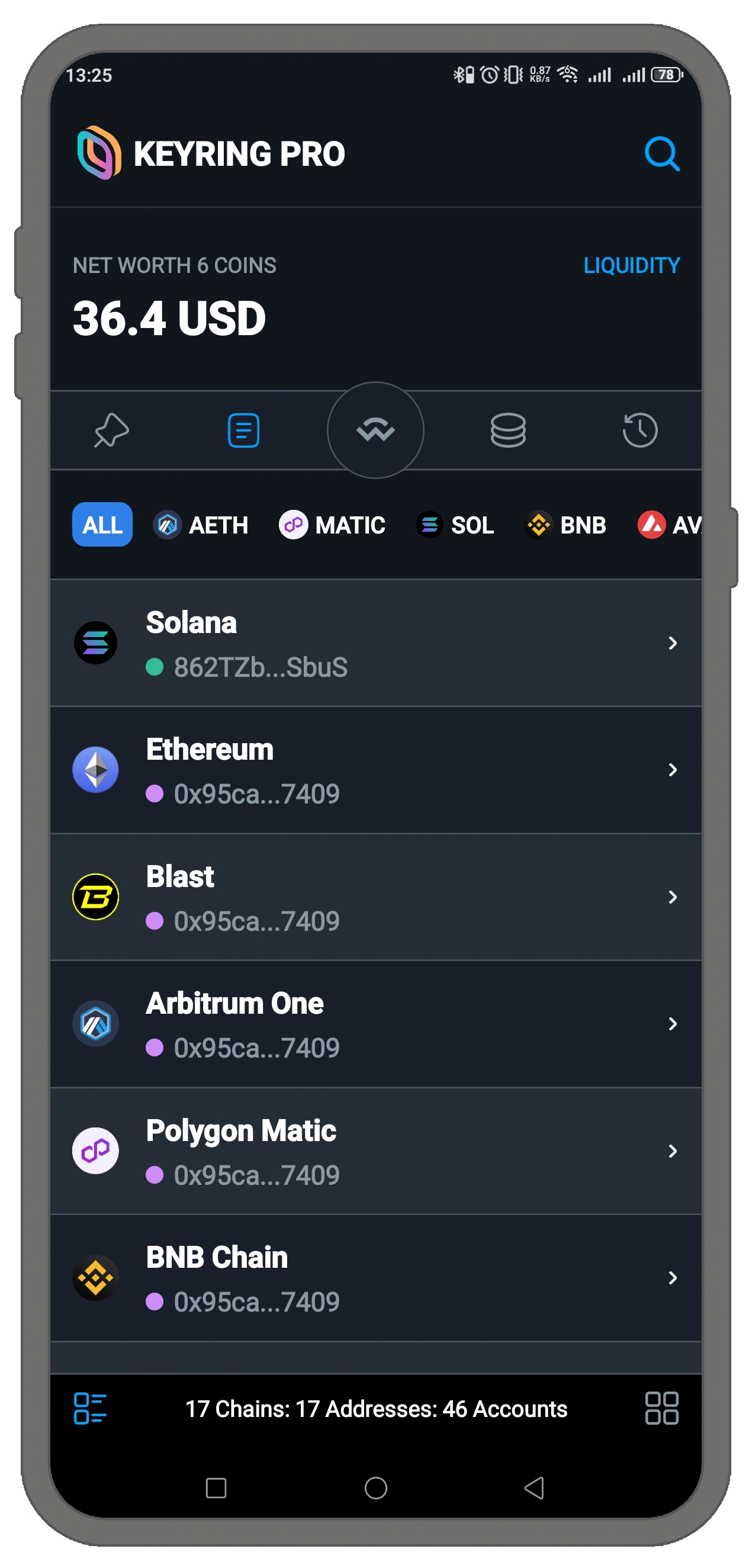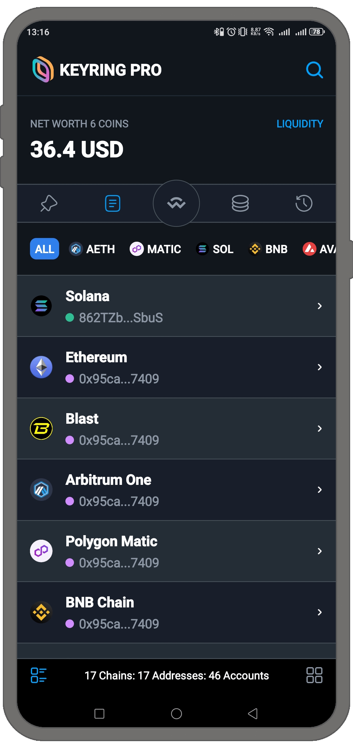 KEYRING PRO 钱包允许用户刷新资产页面以更新其代币余额。