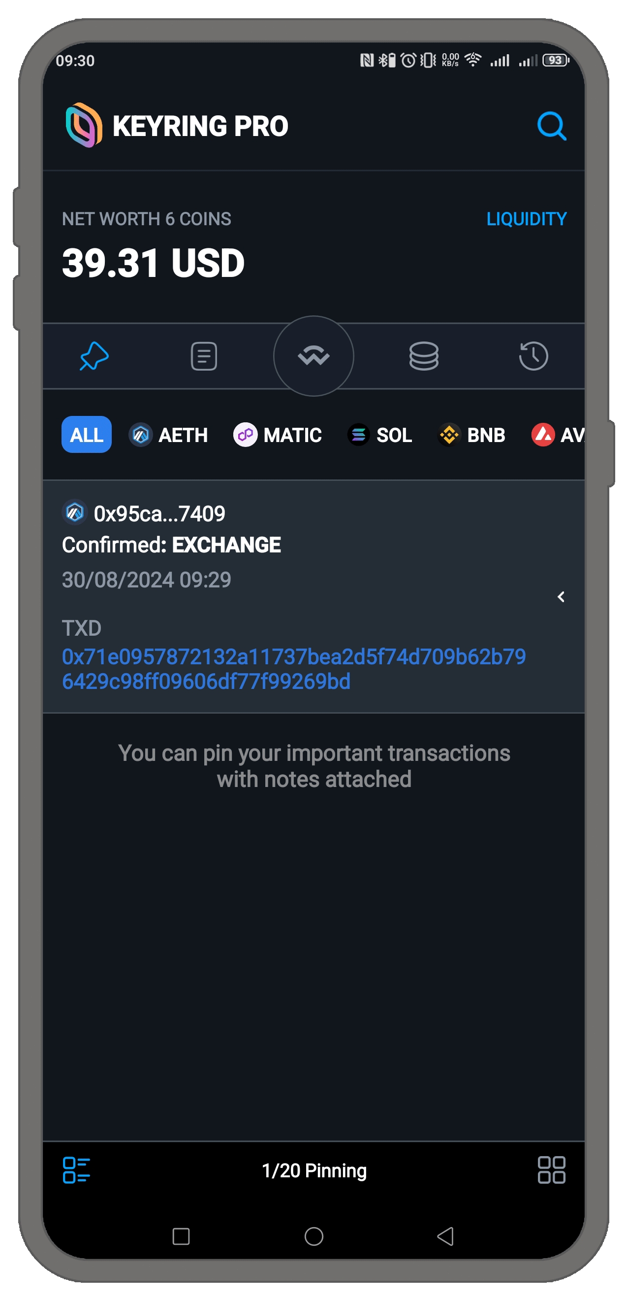 完成交易后,KEYRING PRO Wallet 会提供一个交易哈希(简称 TXH)。